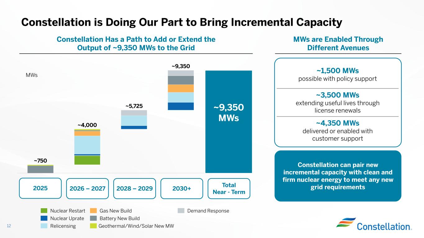 ~1,500 MWs possible with policy support ~3,500 MWs extending useful lives through license renewals ~4,350 MWs delivered or enabled with customer support Constellation is Doing Our Part to Bring Incremental Capacity 12 2026 – 2027 2030+2028 – 2029 ~9,350 MWs Total Near - Term ~750 ~4,000 ~5,725 ~9,350 Nuclear Restart Nuclear Uprate Relicensing Gas New Build Battery New Build Geothermal/Wind/Solar New MW Demand Response MWs 2025 MWs are Enabled Through Different Avenues Constellation Has a Path to Add or Extend the Output of ~9,350 MWs to the Grid Constellation can pair new incremental capacity with clean and firm nuclear energy to meet any new grid requirements