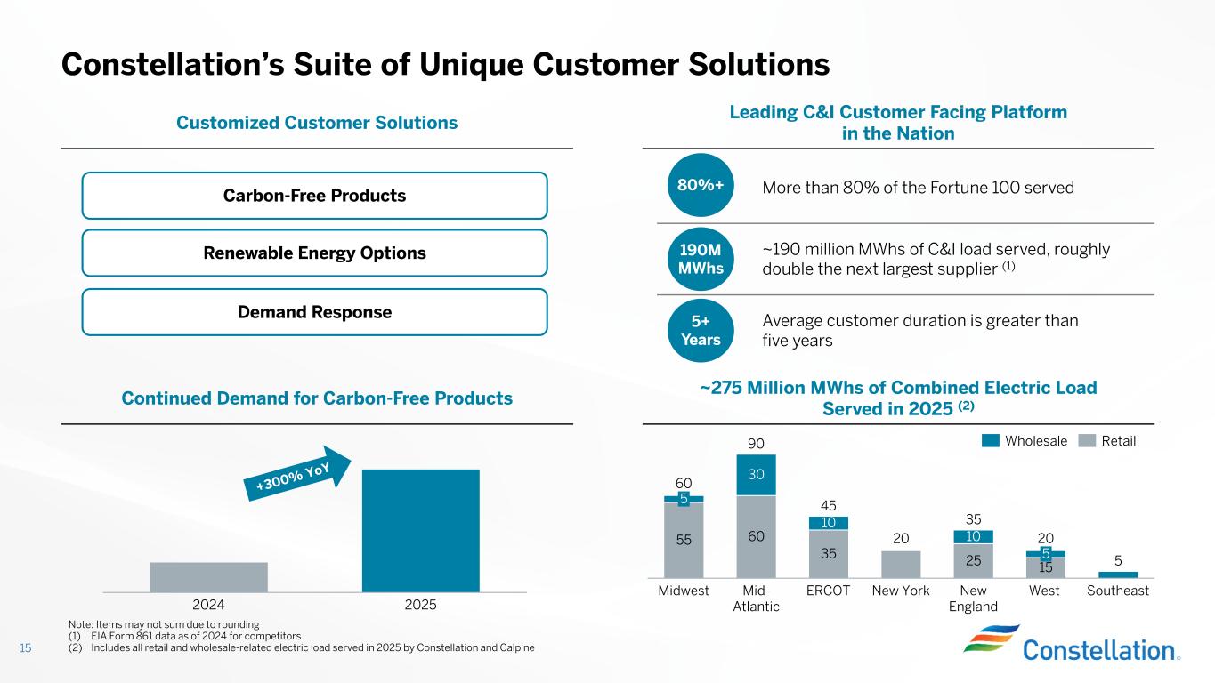 14 Constellation Powers America Coast-to-Coast Aligning on best practices across the organization for strategic and operational success Opportunities for cross-selling and product innovation Operating Calpine under a BBB+ balance sheet creates new avenues for commercial growth Note: Calpine assets pending divestiture and assets located in Canada are not included on the map (1) Based on percentage of 2025 MWhs produced in our portfolio, excluding Calpine assets pending divestiture (2) Other may include ISO-NE, IESO, MISO, SPP, AESO, and assets not located in an ISO Coast-to-coast scale – significant presence across every competitive market Retail territories Presence (40 states) Net Capacity (MW) 1 2,390 Facilities Nuclear Hydro Natural Gas/Oil Wind/Solar/Storage Geothermal % MWhs Produced (1)ISO 50%PJM 23%ERCOT 10%Other (2) 9%NYISO 8%CAISO