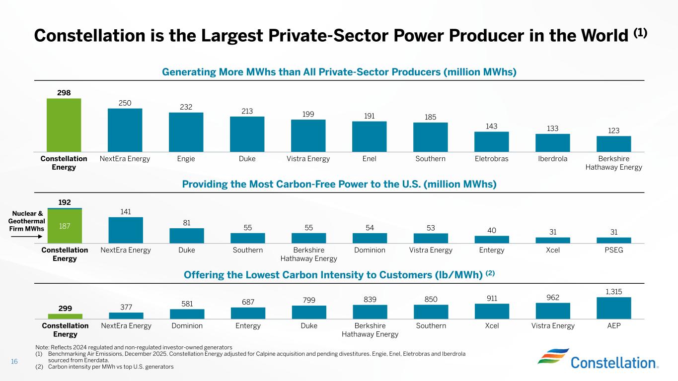 15 Constellation’s Suite of Unique Customer Solutions Leading C&I Customer Facing Platform in the Nation Customized Customer Solutions More than 80% of the Fortune 100 served ~190 million MWhs of C&I load served, roughly double the next largest supplier (1) Average customer duration is greater than five years ~275 Million MWhs of Combined Electric Load Served in 2025 (2)Continued Demand for Carbon-Free Products 2024 2025 Renewable Energy Options Carbon-Free Products Demand Response 55 60 35 20 25 15 30 10 10 5 Midwest Mid- Atlantic ERCOT New York New England 5 West Southeast 60 90 45 35 20 5 Wholesale Retail Note: Items may not sum due to rounding (1) EIA Form 861 data as of 2024 for competitors (2) Includes all retail and wholesale-related electric load served in 2025 by Constellation and Calpine 80%+ 190M MWhs 5+ Years
