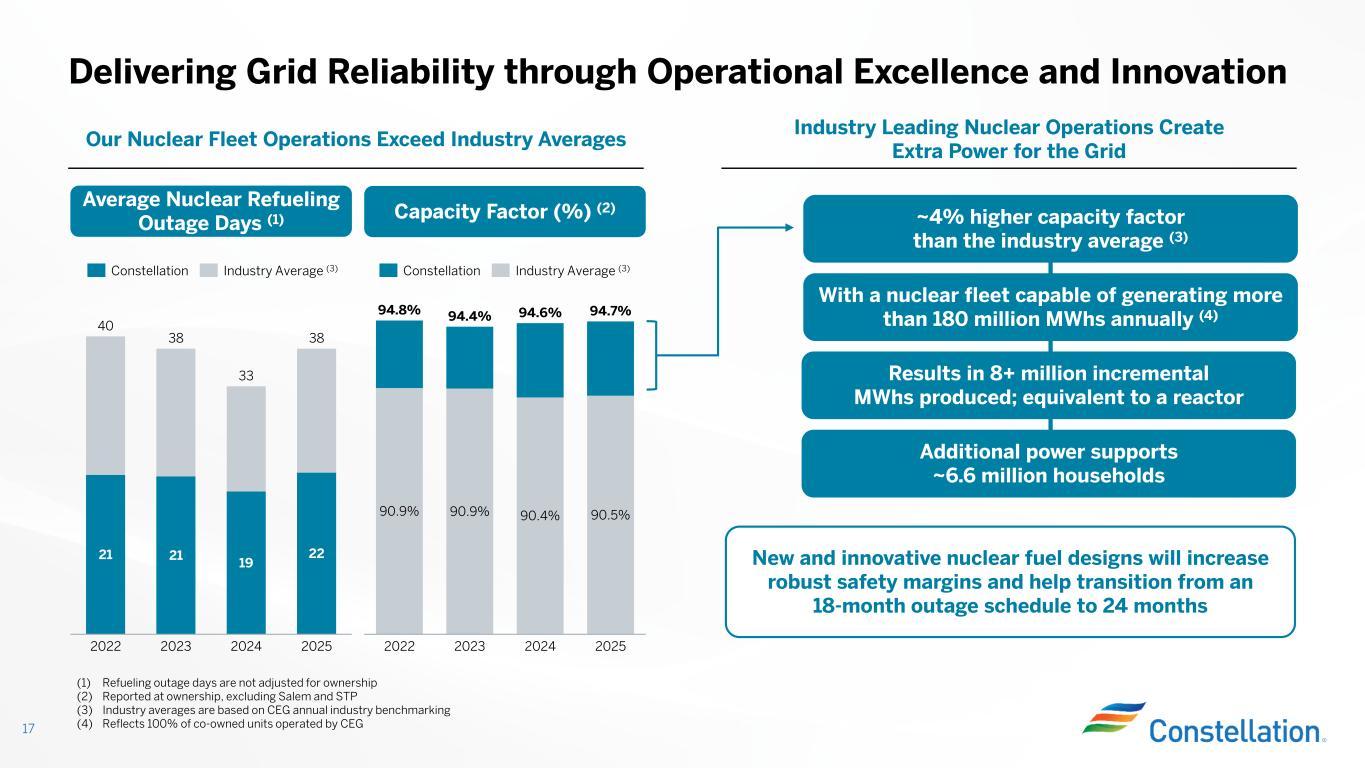 Nuclear & Geothermal Firm MWhs Constellation is the Largest Private-Sector Power Producer in the World (1) 16 298 250 232 213 199 191 185 143 133 123 Constellation Energy NextEra Energy Engie Duke Vistra Energy Enel Southern Eletrobras Iberdrola Berkshire Hathaway Energy Providing the Most Carbon-Free Power to the U.S. (million MWhs) 187 Constellation Energy NextEra Energy Duke Southern Berkshire Hathaway Energy Dominion Vistra Energy Entergy Xcel PSEG 192 141 81 55 55 54 53 40 31 31 Generating More MWhs than All Private-Sector Producers (million MWhs) Offering the Lowest Carbon Intensity to Customers (lb/MWh) (2) 299 377 581 687 799 839 850 911 962 1,315 Constellation Energy NextEra Energy Dominion Entergy Duke Berkshire Hathaway Energy Southern Xcel Vistra Energy AEP Note: Reflects 2024 regulated and non-regulated investor-owned generators (1) Benchmarking Air Emissions, December 2025. Constellation Energy adjusted for Calpine acquisition and pending divestitures. Engie, Enel, Eletrobras and Iberdrola sourced from Enerdata. (2) Carbon intensity per MWh vs top U.S. generators