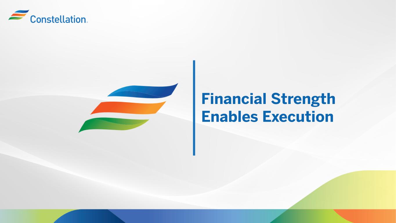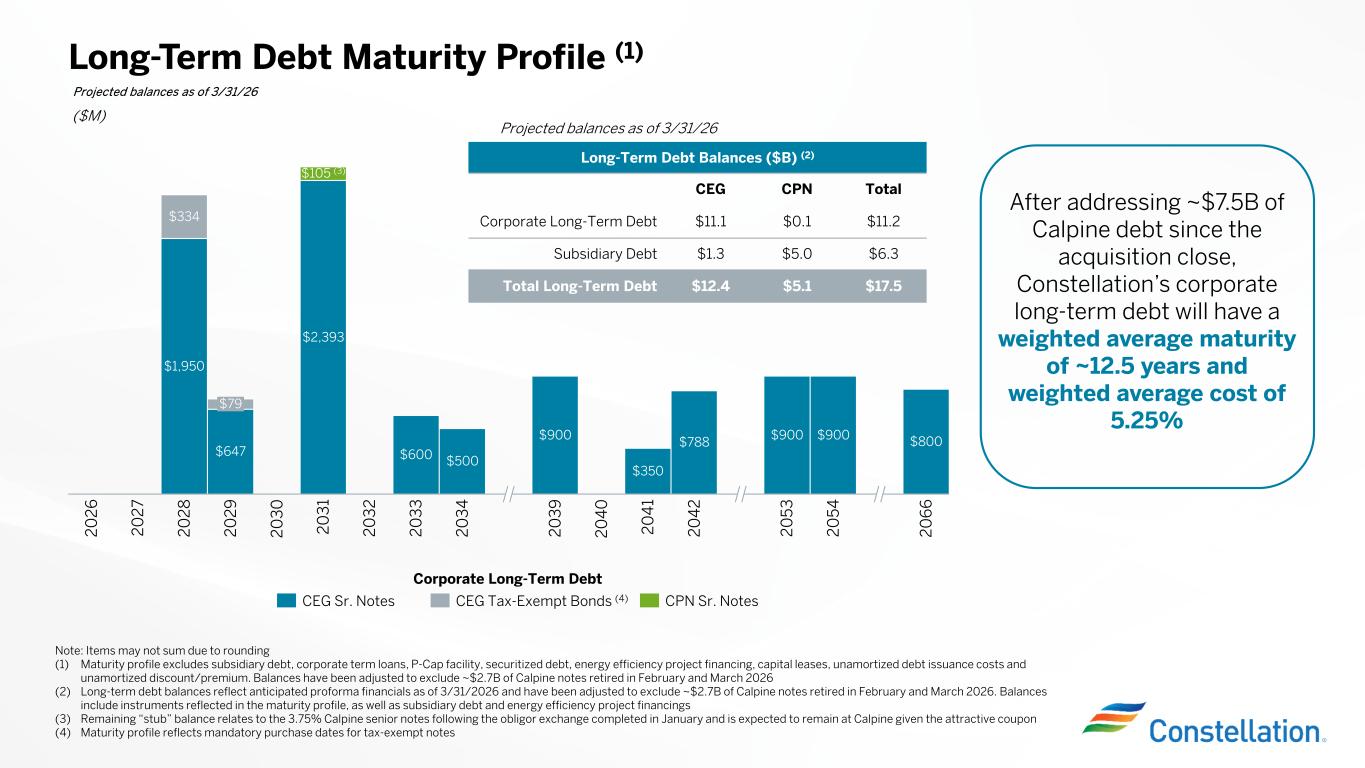 ($M) CEG Sr. Notes CEG Tax-Exempt Bonds (4) CPN Sr. Notes Long-Term Debt Maturity Profile (1) Corporate Long-Term Debt Projected balances as of 3/31/26 Note: Items may not sum due to rounding (1) Maturity profile excludes subsidiary debt, corporate term loans, P-Cap facility, securitized debt, energy efficiency project financing, capital leases, unamortized debt issuance costs and unamortized discount/premium. Balances have been adjusted to exclude ~$2.7B of Calpine notes retired in February and March 2026 (2) Long-term debt balances reflect anticipated proforma financials as of 3/31/2026 and have been adjusted to exclude ~$2.7B of Calpine notes retired in February and March 2026. Balances include instruments reflected in the maturity profile, as well as subsidiary debt and energy efficiency project financings (3) Remaining “stub” balance relates to the 3.75% Calpine senior notes following the obligor exchange completed in January and is expected to remain at Calpine given the attractive coupon (4) Maturity profile reflects mandatory purchase dates for tax-exempt notes $1,950 $647 $2,393 $600 $500 $900 $350 $788 $900 $900 $800 $334 2 0 2 6 2 0 2 7 2 0 2 8 $79 2 0 2 9 2 0 3 0 $105 (3) 2 0 3 1 2 0 3 2 2 0 3 3 2 0 3 4 2 0 3 9 2 0 4 0 2 0 4 1 2 0 4 2 2 0 5 3 2 0 5 4 2 0 6 6 Long-Term Debt Balances ($B) (2) TotalCPNCEG $11.2$0.1$11.1Corporate Long-Term Debt $6.3$5.0$1.3Subsidiary Debt $17.5$5.1$12.4Total Long-Term Debt Projected balances as of 3/31/26 After addressing ~$7.5B of Calpine debt since the acquisition close, Constellation’s corporate long-term debt will have a weighted average maturity of ~12.5 years and weighted average cost of 5.25%