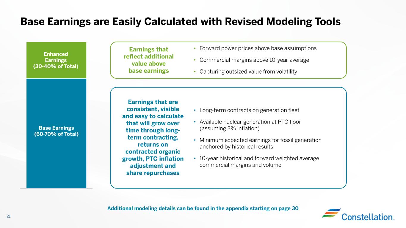 Base Earnings are Easily Calculated with Revised Modeling Tools 21 Additional modeling details can be found in the appendix starting on page 30 Enhanced Earnings (30-40% of Total) Base Earnings (60-70% of Total) Earnings that reflect additional value above base earnings Earnings that are consistent, visible and easy to calculate that will grow over time through long- term contracting, returns on contracted organic growth, PTC inflation adjustment and share repurchases • Forward power prices above base assumptions • Commercial margins above 10-year average • Capturing outsized value from volatility • Long-term contracts on generation fleet • Available nuclear generation at PTC floor (assuming 2% inflation) • Minimum expected earnings for fossil generation anchored by historical results • 10-year historical and forward weighted average commercial margins and volume