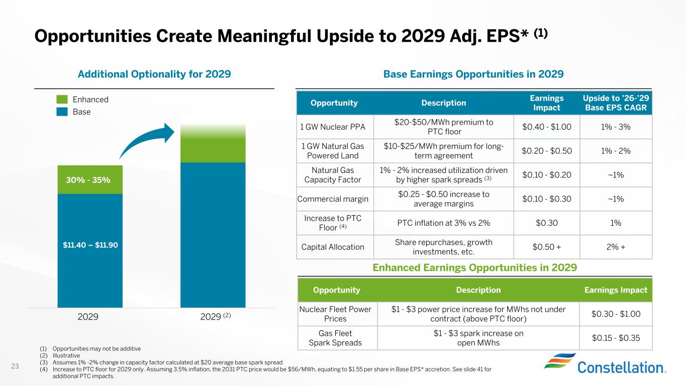 Initiating 2026 Adjusted Operating Earnings* Guidance of $11.00 - $12.00 Per Share (1) 22 $6.65 - $6.75 ~40% of Total 2026 (2) $7.60 - $7.70 35% - 40% of Total 2027 $11.40 - $11.90 30% - 35% of Total 2029 Guidance Range $11.00 - $12.00 (1) Full-year 2026 earnings guidance is based on expected average diluted common shares outstanding of 361 million (2) 2026 disclosures include earnings contribution from assets to be divested in 2H 2026 (3) Forward looking market prices as of 12/31/2025 2029 Projection Includes: 2029 Projection Does Not Include: • Incremental long-term deals • Higher gas plant utilization • Expanding Commercial margins • Higher return growth investments • Announced nuclear and gas long-term offtakes • Nuclear PTC at 2% inflation • Average Commercial margins • Current expectations (3) for forward looking market prices Enhanced Base