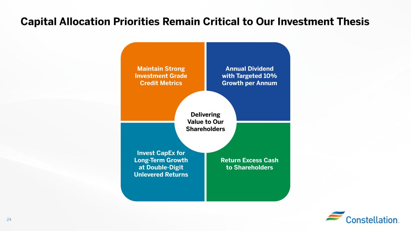 Opportunities Create Meaningful Upside to 2029 Adj. EPS* (1) 23 Base Earnings Opportunities in 2029Additional Optionality for 2029 Earnings ImpactDescriptionOpportunity $0.30 - $1.00 $1 - $3 power price increase for MWhs not under contract (above PTC floor) Nuclear Fleet Power Prices $0.15 - $0.35 $1 - $3 spark increase on open MWhs Gas Fleet Spark Spreads Upside to ’26-’29 Base EPS CAGR Earnings Impact DescriptionOpportunity 1% - 3%$0.40 - $1.00 $20-$50/MWh premium to PTC floor 1 GW Nuclear PPA 1% - 2%$0.20 - $0.50 $10-$25/MWh premium for long- term agreement 1 GW Natural Gas Powered Land ~1%$0.10 - $0.20 1% - 2% increased utilization driven by higher spark spreads (3) Natural Gas Capacity Factor ~1%$0.10 - $0.30 $0.25 - $0.50 increase to average margins Commercial margin 1%$0.30PTC inflation at 3% vs 2% Increase to PTC Floor (4) 2% +$0.50 + Share repurchases, growth investments, etc. Capital Allocation (1) Opportunities may not be additive (2) Illustrative (3) Assumes 1% -2% change in capacity factor calculated at $20 average base spark spread (4) Increase to PTC floor for 2029 only. Assuming 3.5% inflation, the 2031 PTC price would be $56/MWh, equating to $1.55 per share in Base EPS* accretion. See slide 41 for additional PTC impacts. Enhanced Earnings Opportunities in 2029 30% - 35% $11.40 – $11.90 2029 2029 (2) Enhanced Base
