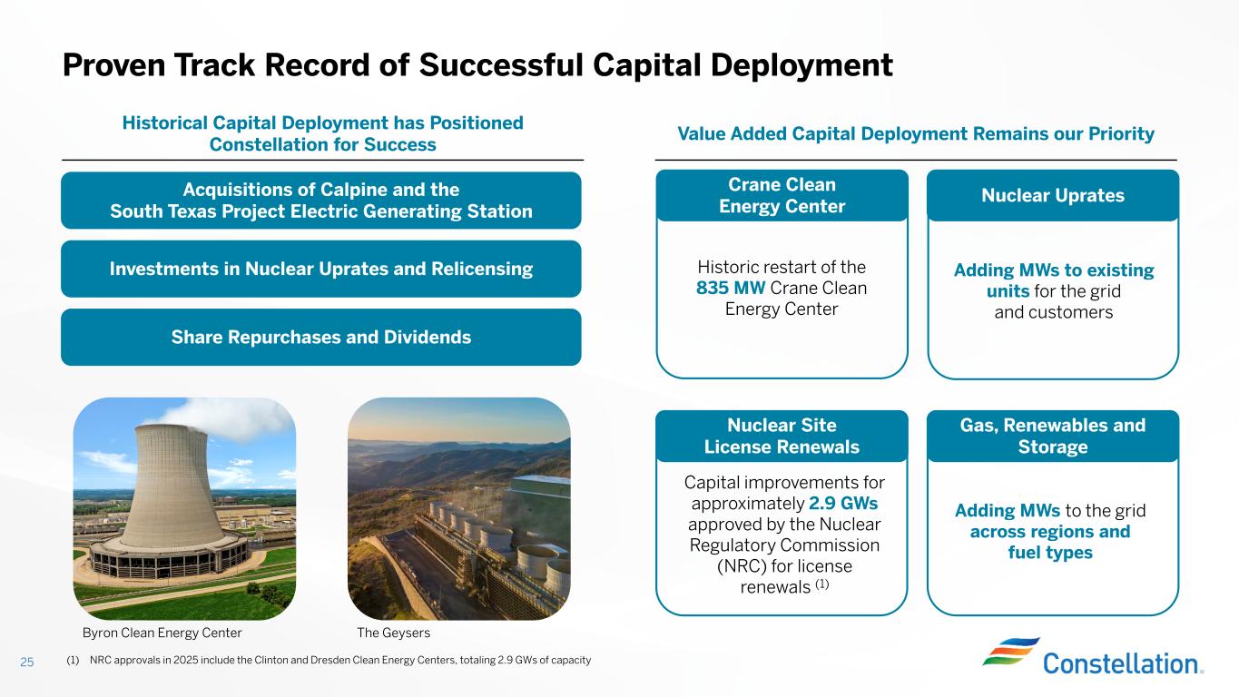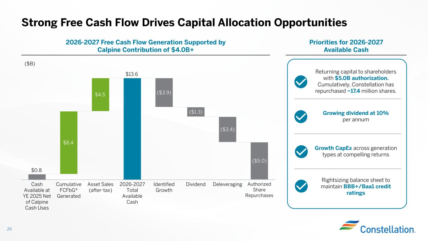 Proven Track Record of Successful Capital Deployment 25 Historic restart of the 835 MW Crane Clean Energy Center Adding MWs to existing units for the grid and customers Adding MWs to the grid across regions and fuel types Gas, Renewables and Storage Nuclear Uprates Capital improvements for approximately 2.9 GWs approved by the Nuclear Regulatory Commission (NRC) for license renewals (1) Acquisitions of Calpine and the South Texas Project Electric Generating Station Value Added Capital Deployment Remains our Priority Historical Capital Deployment has Positioned Constellation for Success Share Repurchases and Dividends Investments in Nuclear Uprates and Relicensing Byron Clean Energy Center The Geysers Crane Clean Energy Center Nuclear Site License Renewals (1) NRC approvals in 2025 include the Clinton and Dresden Clean Energy Centers, totaling 2.9 GWs of capacity
