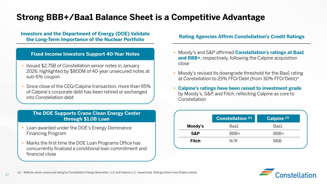 Strong BBB+/Baa1 Balance Sheet is a Competitive Advantage Rating Agencies Affirm Constellation’s Credit Ratings Investors and the Department of Energy (DOE) Validate the Long-Term Importance of the Nuclear Portfolio Fixed Income Investors Support 40-Year Notes • Issued $2.75B of Constellation senior notes in January 2026, highlighted by $800M of 40-year unsecured notes at sub-6% coupon • Since close of the CEG/Calpine transaction, more than 95% of Calpine’s corporate debt has been retired or exchanged into Constellation debt The DOE Supports Crane Clean Energy Center through $1.0B Loan • Loan awarded under the DOE’s Energy Dominance Financing Program • Marks the first time the DOE Loan Programs Office has concurrently finalized a conditional loan commitment and financial close 27 • Moody’s and S&P affirmed Constellation’s ratings at Baa1 and BBB+, respectively, following the Calpine acquisition close • Moody’s revised its downgrade threshold for the Baa1 rating at Constellation to 25% FFO/Debt (from 30% FFO/Debt)* • Calpine’s ratings have been raised to investment grade by Moody’s, S&P, and Fitch, reflecting Calpine as core to Constellation Calpine (1)Constellation (1) Baa1Baa1Moody’s BBB+BBB+S&P BBBN/RFitch (1) Reflects senior unsecured rating for Constellation Energy Generation, LLC and Calpine LLC, respectively. Ratings shown have Stable outlook.
