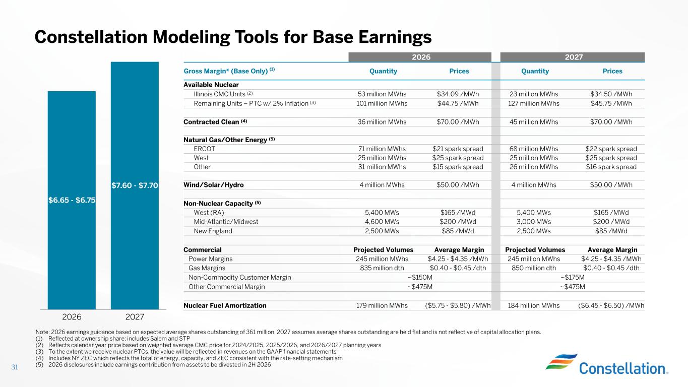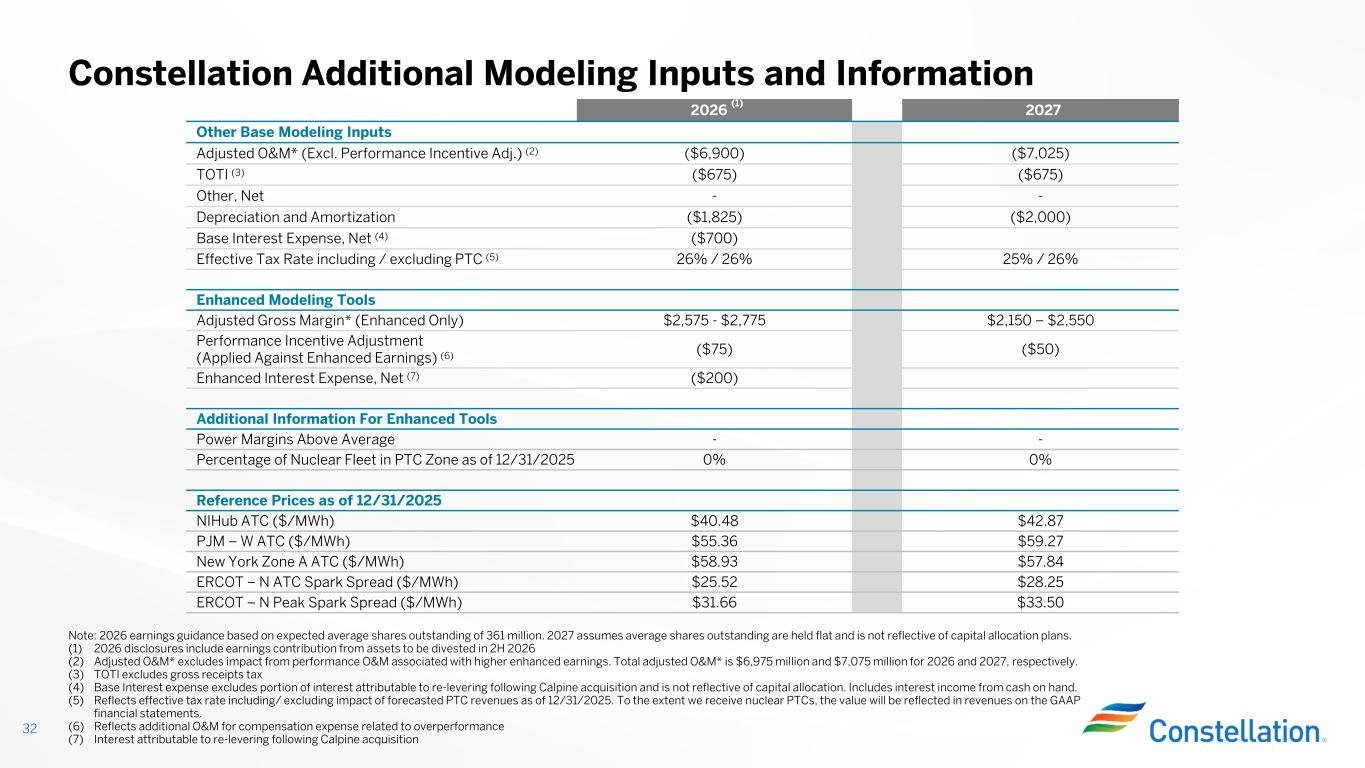 Constellation Modeling Tools for Base Earnings 31 Note: 2026 earnings guidance based on expected average shares outstanding of 361 million. 2027 assumes average shares outstanding are held flat and is not reflective of capital allocation plans. (1) Reflected at ownership share; includes Salem and STP (2) Reflects calendar year price based on weighted average CMC price for 2024/2025, 2025/2026, and 2026/2027 planning years (3) To the extent we receive nuclear PTCs, the value will be reflected in revenues on the GAAP financial statements (4) Includes NY ZEC which reflects the total of energy, capacity, and ZEC consistent with the rate-setting mechanism (5) 2026 disclosures include earnings contribution from assets to be divested in 2H 2026 20272026 PricesQuantityPricesQuantityGross Margin* (Base Only) (1) Available Nuclear $34.50 /MWh23 million MWhs$34.09 /MWh53 million MWhsIllinois CMC Units (2) $45.75 /MWh127 million MWhs$44.75 /MWh101 million MWhsRemaining Units – PTC w/ 2% Inflation (3) $70.00 /MWh45 million MWhs$70.00 /MWh36 million MWhsContracted Clean (4) Natural Gas/Other Energy (5) $22 spark spread68 million MWhs$21 spark spread71 million MWhsERCOT $25 spark spread25 million MWhs$25 spark spread25 million MWhsWest $16 spark spread26 million MWhs$15 spark spread31 million MWhsOther $50.00 /MWh4 million MWhs$50.00 /MWh4 million MWhsWind/Solar/Hydro Non-Nuclear Capacity (5) $165 /MWd5,400 MWs$165 /MWd5,400 MWsWest (RA) $200 /MWd3,000 MWs$200 /MWd4,600 MWsMid-Atlantic/Midwest $85 /MWd2,500 MWs$85 /MWd2,500 MWsNew England Average MarginProjected VolumesAverage MarginProjected VolumesCommercial $4.25 - $4.35 /MWh245 million MWhs$4.25 - $4.35 /MWh245 million MWhsPower Margins $0.40 - $0.45 /dth850 million dth$0.40 - $0.45 /dth835 million dthGas Margins ~$175M~$150MNon-Commodity Customer Margin ~$475M~$475MOther Commercial Margin ($6.45 - $6.50) /MWh184 million MWhs($5.75 - $5.80) /MWh179 million MWhsNuclear Fuel Amortization $6.65 - $6.75 2026 $7.60 - $7.70 2027