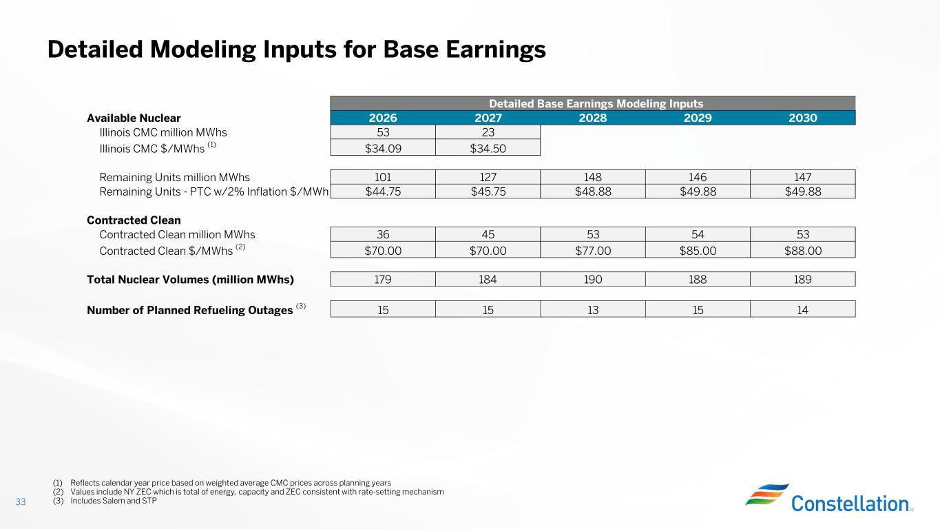 Constellation Additional Modeling Inputs and Information 32 Note: 2026 earnings guidance based on expected average shares outstanding of 361 million. 2027 assumes average shares outstanding are held flat and is not reflective of capital allocation plans. (1) 2026 disclosures include earnings contribution from assets to be divested in 2H 2026 (2) Adjusted O&M* excludes impact from performance O&M associated with higher enhanced earnings. Total adjusted O&M* is $6,975 million and $7,075 million for 2026 and 2027, respectively. (3) TOTI excludes gross receipts tax (4) Base Interest expense excludes portion of interest attributable to re-levering following Calpine acquisition and is not reflective of capital allocation. Includes interest income from cash on hand. (5) Reflects effective tax rate including/ excluding impact of forecasted PTC revenues as of 12/31/2025. To the extent we receive nuclear PTCs, the value will be reflected in revenues on the GAAP financial statements. (6) Reflects additional O&M for compensation expense related to overperformance (7) Interest attributable to re-levering following Calpine acquisition 20272026 (1) Other Base Modeling Inputs ($7,025)($6,900)Adjusted O&M* (Excl. Performance Incentive Adj.) (2) ($675)($675)TOTI (3) --Other, Net ($2,000)($1,825)Depreciation and Amortization ($700)Base Interest Expense, Net (4) 25% / 26%26% / 26%Effective Tax Rate including / excluding PTC (5) Enhanced Modeling Tools $2,150 – $2,550$2,575 - $2,775Adjusted Gross Margin* (Enhanced Only) ($50)($75) Performance Incentive Adjustment (Applied Against Enhanced Earnings) (6) ($200)Enhanced Interest Expense, Net (7) Additional Information For Enhanced Tools --Power Margins Above Average 0%0%Percentage of Nuclear Fleet in PTC Zone as of 12/31/2025 Reference Prices as of 12/31/2025 $42.87$40.48NIHub ATC ($/MWh) $59.27$55.36PJM – W ATC ($/MWh) $57.84$58.93New York Zone A ATC ($/MWh) $28.25$25.52ERCOT – N ATC Spark Spread ($/MWh) $33.50$31.66ERCOT – N Peak Spark Spread ($/MWh)
