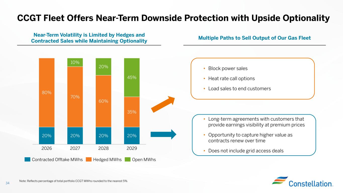 Detailed Modeling Inputs for Base Earnings 33 (1) Reflects calendar year price based on weighted average CMC prices across planning years (2) Values include NY ZEC which is total of energy, capacity and ZEC consistent with rate-setting mechanism (3) Includes Salem and STP Detailed Base Earnings Modeling Inputs Available Nuclear 2026 2027 2028 2029 2030 Illinois CMC million MWhs 53 23 Illinois CMC $/MWhs (1) $34.09 $34.50 Remaining Units million MWhs 101 127 148 146 147 Remaining Units - PTC w/2% Inflation $/MWh $44.75 $45.75 $48.88 $49.88 $49.88 Contracted Clean Contracted Clean million MWhs 36 45 53 54 53 Contracted Clean $/MWhs (2) $70.00 $70.00 $77.00 $85.00 $88.00 Total Nuclear Volumes (million MWhs) 179 184 190 188 189 Number of Planned Refueling Outages (3) 15 15 13 15 14