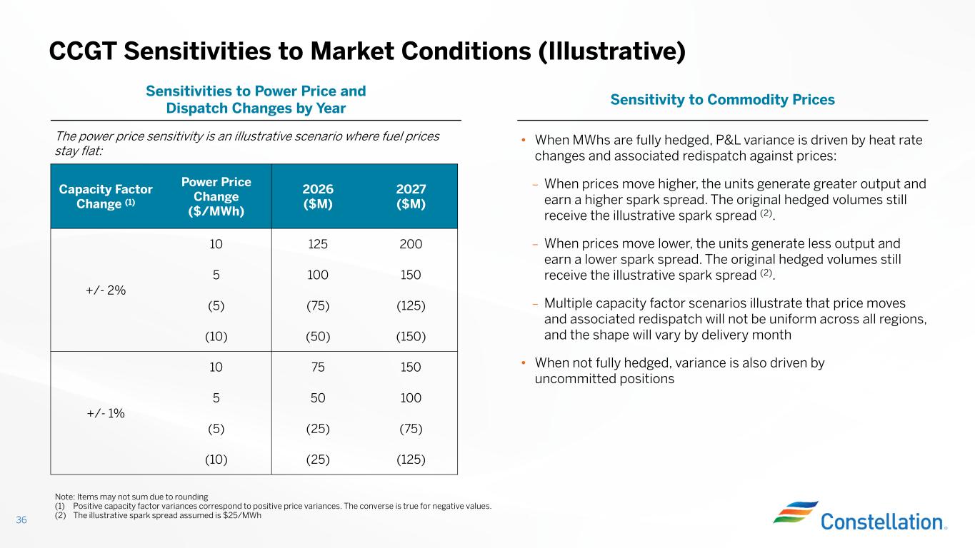 CCGT Sensitivities to Market Conditions (Illustrative) 36 Sensitivity to Commodity Prices Sensitivities to Power Price and Dispatch Changes by Year 2027 ($M) 2026 ($M) Power Price Change ($/MWh) Capacity Factor Change (1) 20012510 +/- 2% 1501005 (125)(75)(5) (150)(50)(10) 1507510 +/- 1% 10050 5 (75)(25)(5) (125)(25)(10) • When MWhs are fully hedged, P&L variance is driven by heat rate changes and associated redispatch against prices: – When prices move higher, the units generate greater output and earn a higher spark spread. The original hedged volumes still receive the illustrative spark spread (2). – When prices move lower, the units generate less output and earn a lower spark spread. The original hedged volumes still receive the illustrative spark spread (2). – Multiple capacity factor scenarios illustrate that price moves and associated redispatch will not be uniform across all regions, and the shape will vary by delivery month • When not fully hedged, variance is also driven by uncommitted positions Note: Items may not sum due to rounding (1) Positive capacity factor variances correspond to positive price variances. The converse is true for negative values. (2) The illustrative spark spread assumed is $25/MWh The power price sensitivity is an illustrative scenario where fuel prices stay flat:
