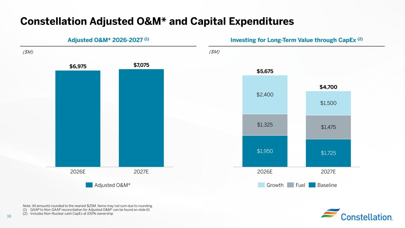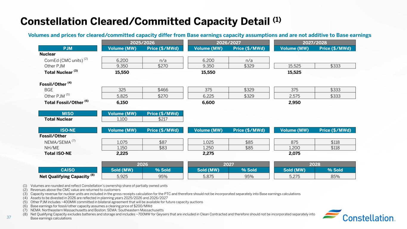 Constellation Cleared/Committed Capacity Detail (1) 37 (1) Volumes are rounded and reflect Constellation’s ownership share of partially owned units (2) Revenues above the CMC value are returned to customers (3) Capacity revenue for nuclear units are included in the gross receipts calculation for the PTC and therefore should not be incorporated separately into Base earnings calculations (4) Assets to be divested in 2026 are reflected in planning years 2025/2026 and 2026/2027 (5) Other PJM includes ~400MW committed in bilateral agreement that will be available for future capacity auctions (6) Base earnings for fossil/other capacity assumes a clearing price of $200/MWd (7) NEMA: Northeastern Massachusetts and Boston; SEMA: Southeastern Massachusetts (8) Net Qualifying Capacity excludes batteries and storage and includes ~700MW for Geysers that are included in Clean Contracted and therefore should not be incorporated separately into Base earnings calculations Volumes and prices for cleared/committed capacity differ from Base earnings capacity assumptions and are not additive to Base earnings PJM Volume (MW) Price ($/MWd) Volume (MW) Price ($/MWd) Volume (MW) Price ($/MWd) Nuclear ComEd (CMC units) (2) 6,200 n/a 6,200 n/a Other PJM 9,350 $270 9,350 $329 15,525 $333 Total Nuclear (3) 15,550 15,550 15,525 Fossil/Other (4) BGE 325 $466 375 $329 375 $333 Other PJM (5) 5,825 $270 6,225 $329 2,575 $333 Total Fossil/Other (6) 6,150 6,600 2,950 MISO Volume (MW) Price ($/MWd) Total Nuclear 1,100 $217 ISO-NE Volume (MW) Price ($/MWd) Volume (MW) Price ($/MWd) Volume (MW) Price ($/MWd) Fossil/Other NEMA/SEMA (7) 1,075 $87 1,025 $85 875 $118 NH/ME 1,150 $83 1,250 $85 1,200 $118 Total ISO-NE 2,225 2,275 2,075 CAISO Sold (MW) % Sold Sold (MW) % Sold Sold (MW) % Sold Net Qualifying Capacity (8) 5,925 95% 5,875 95% 5,275 85% 2025/2026 2026/2027 2027/2028 2026 2027 2028