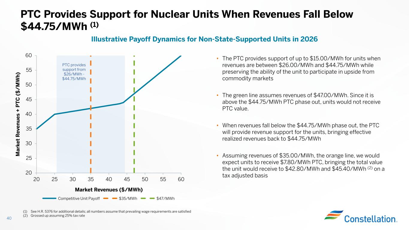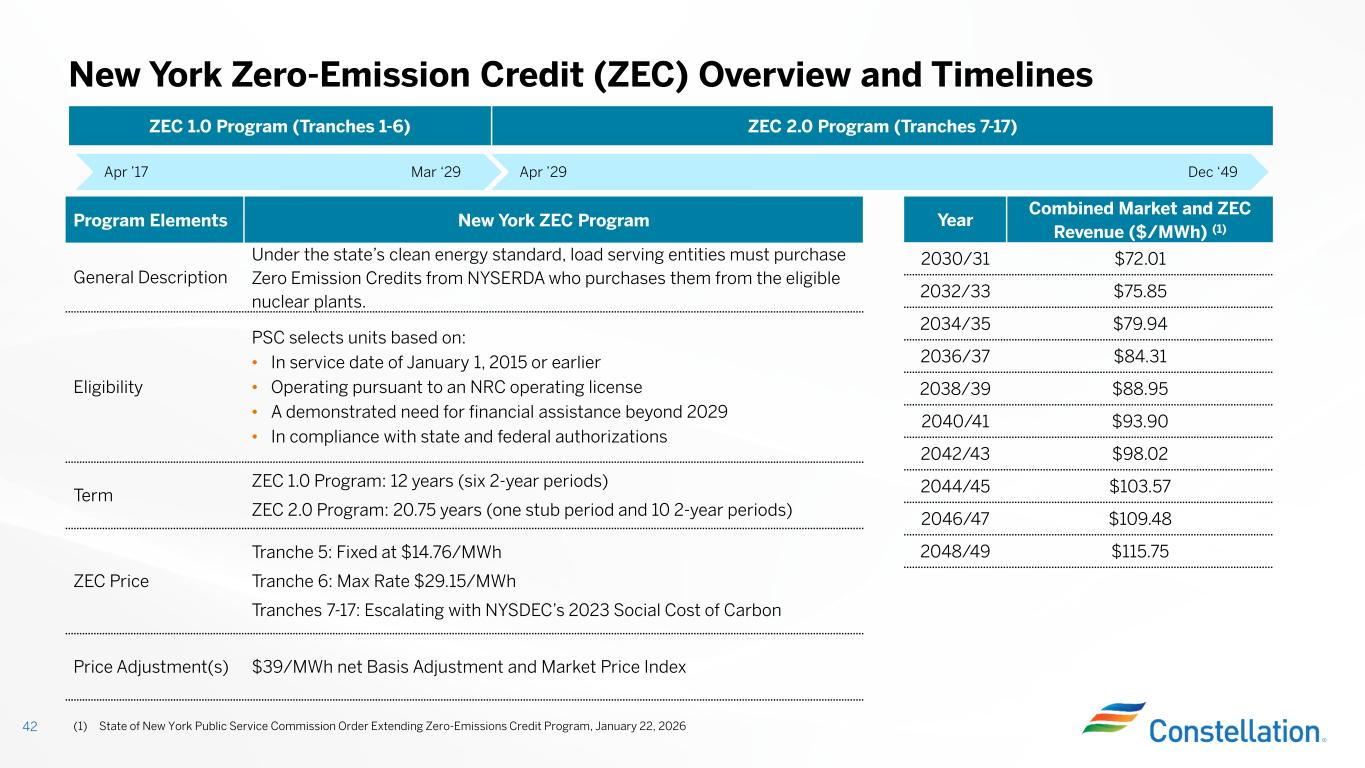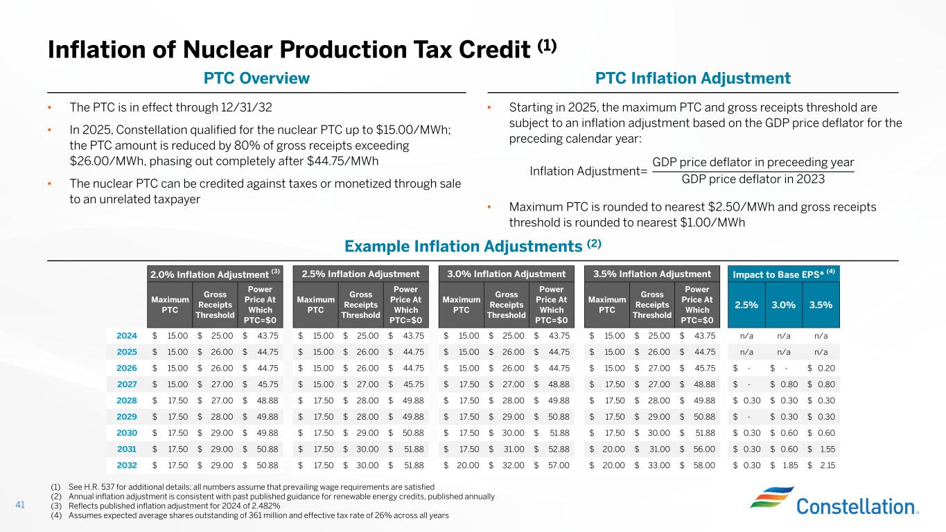 • Starting in 2025, the maximum PTC and gross receipts threshold are subject to an inflation adjustment based on the GDP price deflator for the preceding calendar year: • Maximum PTC is rounded to nearest $2.50/MWh and gross receipts threshold is rounded to nearest $1.00/MWh Inflation of Nuclear Production Tax Credit (1) 41 (1) See H.R. 537 for additional details; all numbers assume that prevailing wage requirements are satisfied (2) Annual inflation adjustment is consistent with past published guidance for renewable energy credits, published annually (3) Reflects published inflation adjustment for 2024 of 2.482% (4) Assumes expected average shares outstanding of 361 million and effective tax rate of 26% across all years PTC Inflation AdjustmentPTC Overview Inflation Adjustment= GDP price deflator in preceeding year GDP price deflator in 2023 • The PTC is in effect through 12/31/32 • In 2025, Constellation qualified for the nuclear PTC up to $15.00/MWh; the PTC amount is reduced by 80% of gross receipts exceeding $26.00/MWh, phasing out completely after $44.75/MWh • The nuclear PTC can be credited against taxes or monetized through sale to an unrelated taxpayer Example Inflation Adjustments (2) Maximum PTC Gross Receipts Threshold Power Price At Which PTC=$0 Maximum PTC Gross Receipts Threshold Power Price At Which PTC=$0 Maximum PTC Gross Receipts Threshold Power Price At Which PTC=$0 Maximum PTC Gross Receipts Threshold Power Price At Which PTC=$0 2.5% 3.0% 3.5% 2024 15.00$ 25.00$ 43.75$ 15.00$ 25.00$ 43.75$ 15.00$ 25.00$ 43.75$ 15.00$ 25.00$ 43.75$ n/a n/a n/a 2025 15.00$ 26.00$ 44.75$ 15.00$ 26.00$ 44.75$ 15.00$ 26.00$ 44.75$ 15.00$ 26.00$ 44.75$ n/a n/a n/a 2026 15.00$ 26.00$ 44.75$ 15.00$ 26.00$ 44.75$ 15.00$ 26.00$ 44.75$ 15.00$ 27.00$ 45.75$ -$ -$ 0.20$ 2027 15.00$ 27.00$ 45.75$ 15.00$ 27.00$ 45.75$ 17.50$ 27.00$ 48.88$ 17.50$ 27.00$ 48.88$ -$ 0.80$ 0.80$ 2028 17.50$ 27.00$ 48.88$ 17.50$ 28.00$ 49.88$ 17.50$ 28.00$ 49.88$ 17.50$ 28.00$ 49.88$ 0.30$ 0.30$ 0.30$ 2029 17.50$ 28.00$ 49.88$ 17.50$ 28.00$ 49.88$ 17.50$ 29.00$ 50.88$ 17.50$ 29.00$ 50.88$ -$ 0.30$ 0.30$ 2030 17.50$ 29.00$ 49.88$ 17.50$ 29.00$ 50.88$ 17.50$ 30.00$ 51.88$ 17.50$ 30.00$ 51.88$ 0.30$ 0.60$ 0.60$ 2031 17.50$ 29.00$ 50.88$ 17.50$ 30.00$ 51.88$ 17.50$ 31.00$ 52.88$ 20.00$ 31.00$ 56.00$ 0.30$ 0.60$ 1.55$ 2032 17.50$ 29.00$ 50.88$ 17.50$ 30.00$ 51.88$ 20.00$ 32.00$ 57.00$ 20.00$ 33.00$ 58.00$ 0.30$ 1.85$ 2.15$ 2.0% Inflation Adjustment (3) 2.5% Inflation Adjustment 3.5% Inflation Adjustment3.0% Inflation Adjustment Impact to Base EPS* (4)