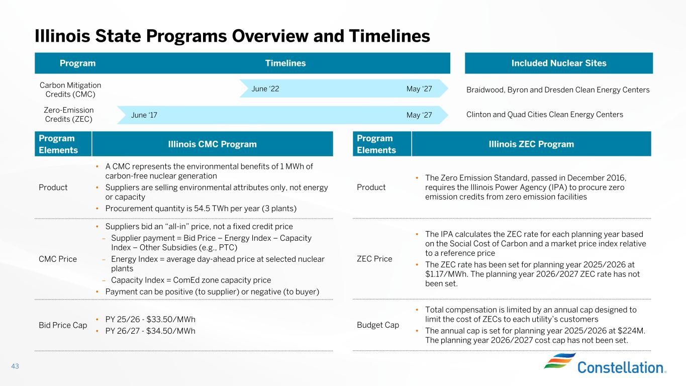 43 Illinois State Programs Overview and Timelines Illinois CMC Program Program Elements • A CMC represents the environmental benefits of 1 MWh of carbon-free nuclear generation • Suppliers are selling environmental attributes only, not energy or capacity • Procurement quantity is 54.5 TWh per year (3 plants) Product • Suppliers bid an “all-in” price, not a fixed credit price – Supplier payment = Bid Price – Energy Index – Capacity Index – Other Subsidies (e.g., PTC) – Energy Index = average day-ahead price at selected nuclear plants – Capacity Index = ComEd zone capacity price • Payment can be positive (to supplier) or negative (to buyer) CMC Price • PY 25/26 - $33.50/MWh • PY 26/27 - $34.50/MWh Bid Price Cap Illinois ZEC Program Program Elements • The Zero Emission Standard, passed in December 2016, requires the Illinois Power Agency (IPA) to procure zero emission credits from zero emission facilities Product • The IPA calculates the ZEC rate for each planning year based on the Social Cost of Carbon and a market price index relative to a reference price • The ZEC rate has been set for planning year 2025/2026 at $1.17/MWh. The planning year 2026/2027 ZEC rate has not been set. ZEC Price • Total compensation is limited by an annual cap designed to limit the cost of ZECs to each utility’s customers • The annual cap is set for planning year 2025/2026 at $224M. The planning year 2026/2027 cost cap has not been set. Budget Cap Included Nuclear SitesTimelinesProgram Carbon Mitigation Credits (CMC) June ‘22 May ‘27 June ‘17 May ‘27 Braidwood, Byron and Dresden Clean Energy Centers Clinton and Quad Cities Clean Energy Centers Zero-Emission Credits (ZEC)