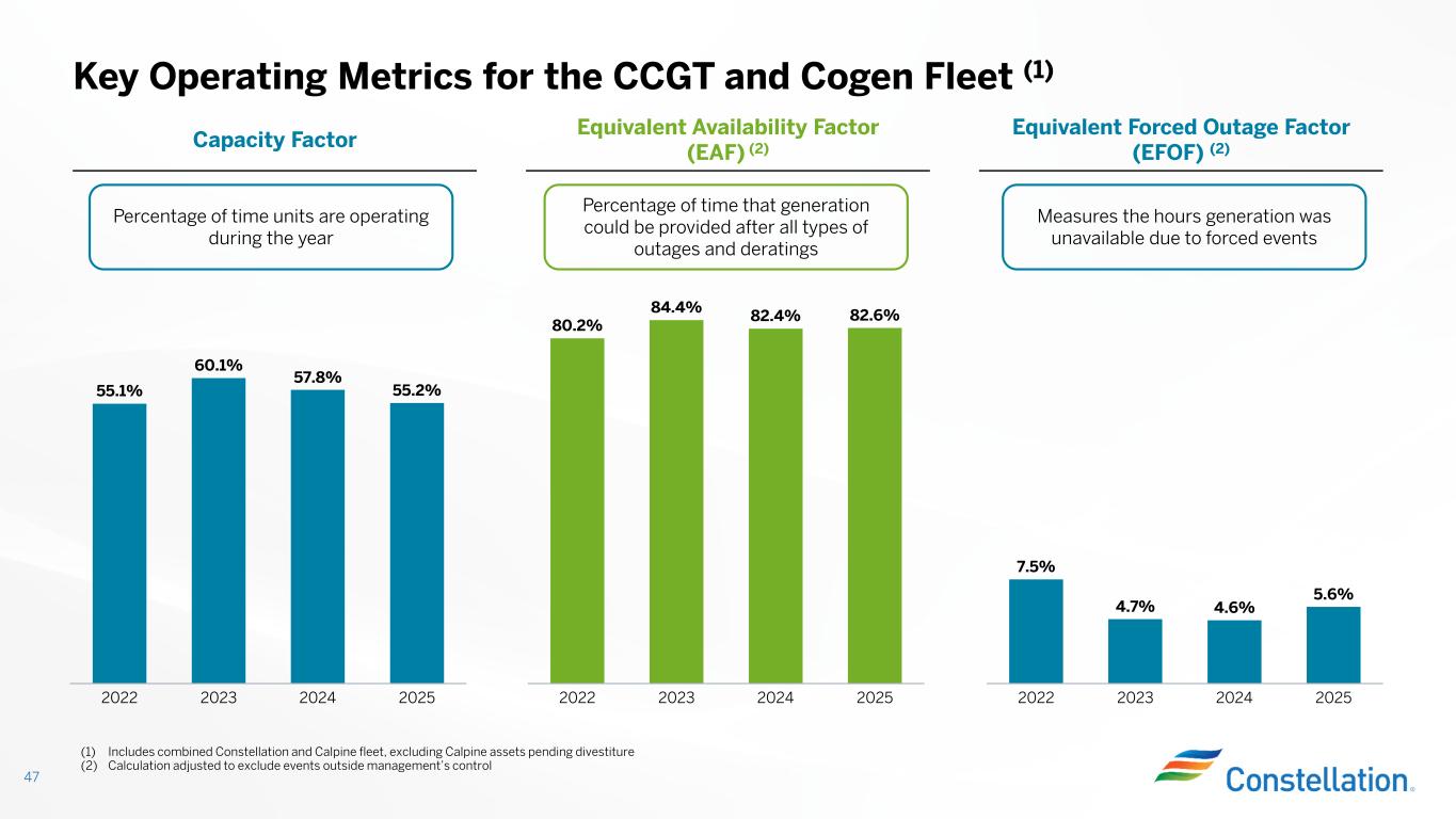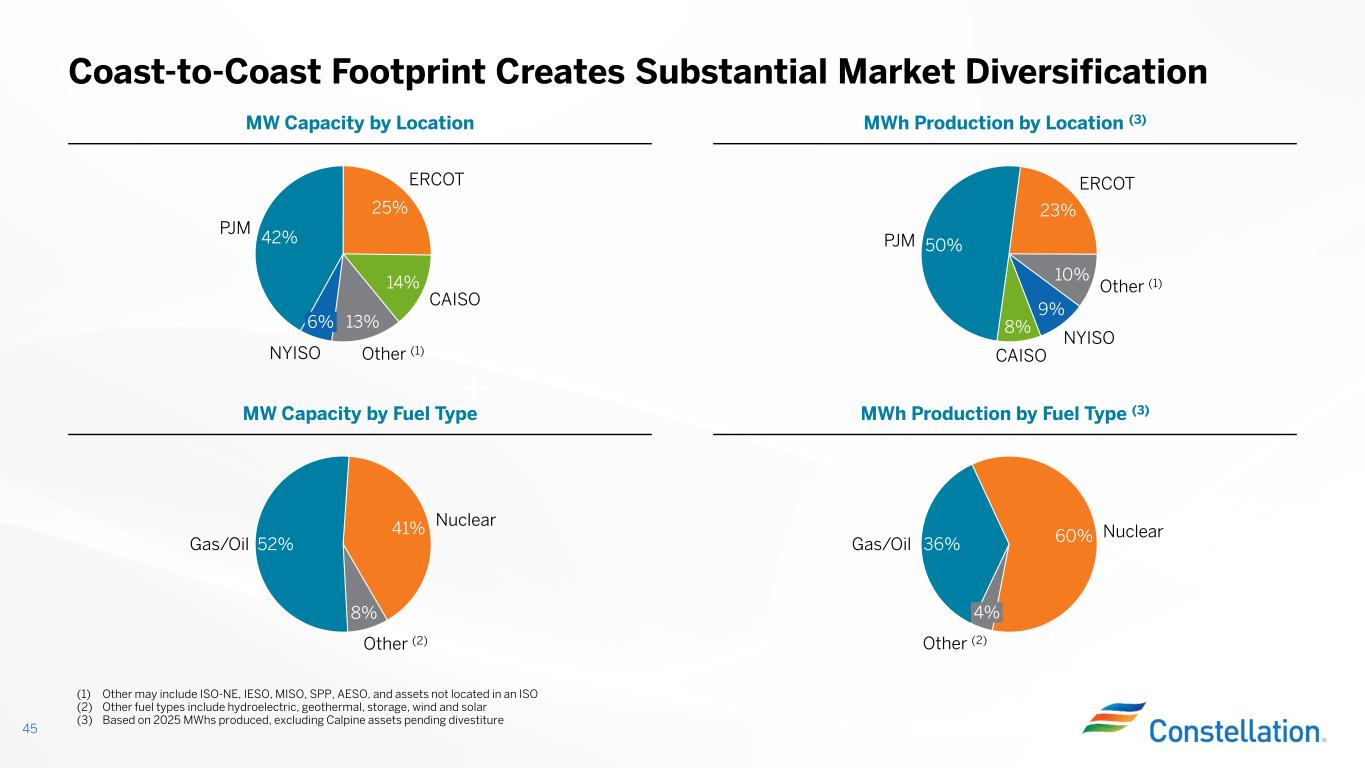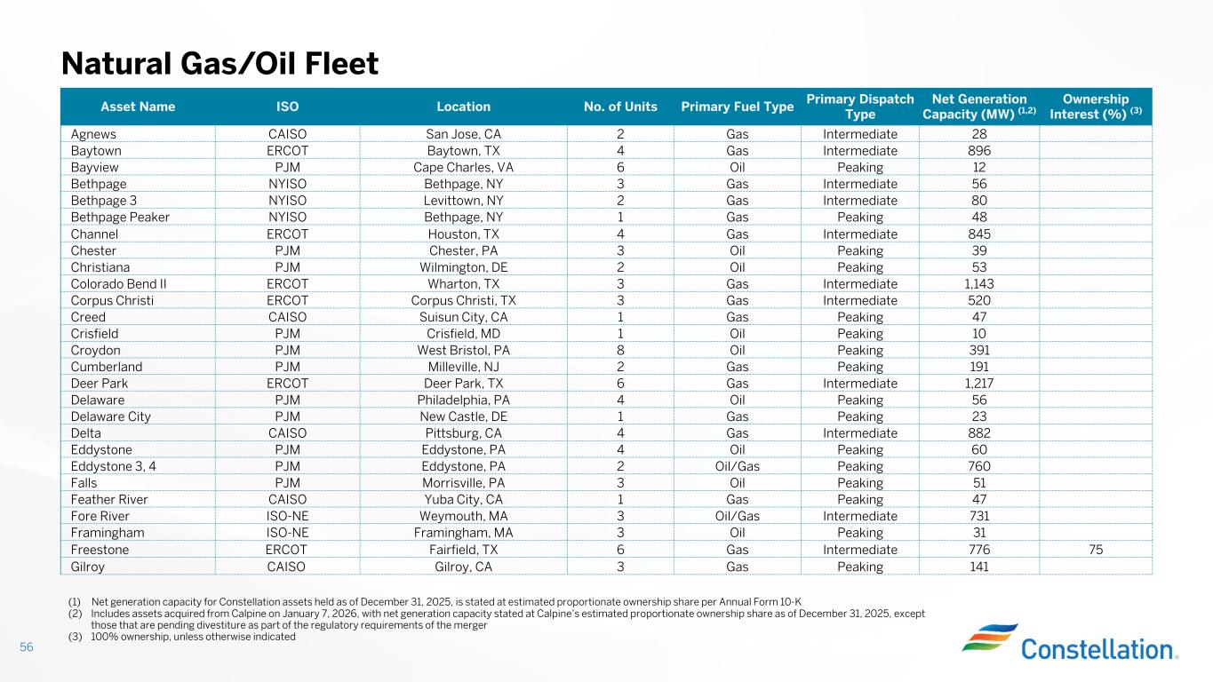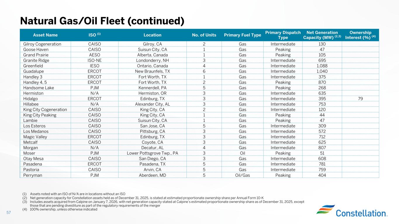 Natural Gas/Oil Fleet 56 Ownership Interest (%) (3) Net Generation Capacity (MW) (1,2) Primary Dispatch Type Primary Fuel TypeNo. of UnitsLocationISOAsset Name 28IntermediateGas2San Jose, CACAISOAgnews 896IntermediateGas4Baytown, TXERCOTBaytown 12PeakingOil6Cape Charles, VAPJMBayview 56IntermediateGas3Bethpage, NYNYISOBethpage 80IntermediateGas2Levittown, NYNYISOBethpage 3 48PeakingGas1Bethpage, NYNYISOBethpage Peaker 845IntermediateGas4Houston, TXERCOTChannel 39PeakingOil3Chester, PAPJMChester 53PeakingOil2Wilmington, DEPJMChristiana 1,143IntermediateGas3Wharton, TXERCOTColorado Bend II 520IntermediateGas3Corpus Christi, TXERCOTCorpus Christi 47PeakingGas1Suisun City, CACAISOCreed 10PeakingOil1Crisfield, MDPJMCrisfield 391PeakingOil8West Bristol, PAPJMCroydon 191PeakingGas2Milleville, NJPJMCumberland 1,217IntermediateGas6Deer Park, TXERCOTDeer Park 56PeakingOil4Philadelphia, PAPJMDelaware 23PeakingGas1New Castle, DEPJMDelaware City 882IntermediateGas4Pittsburg, CACAISODelta 60PeakingOil4Eddystone, PAPJMEddystone 760PeakingOil/Gas2Eddystone, PAPJMEddystone 3, 4 51PeakingOil3Morrisville, PAPJMFalls 47PeakingGas1Yuba City, CACAISOFeather River 731IntermediateOil/Gas3Weymouth, MAISO-NEFore River 31PeakingOil3Framingham, MAISO-NEFramingham 75776IntermediateGas6Fairfield, TXERCOTFreestone 141PeakingGas3Gilroy, CACAISOGilroy (1) Net generation capacity for Constellation assets held as of December 31, 2025, is stated at estimated proportionate ownership share per Annual Form 10-K (2) Includes assets acquired from Calpine on January 7, 2026, with net generation capacity stated at Calpine’s estimated proportionate ownership share as of December 31, 2025, except those that are pending divestiture as part of the regulatory requirements of the merger (3) 100% ownership, unless otherwise indicated