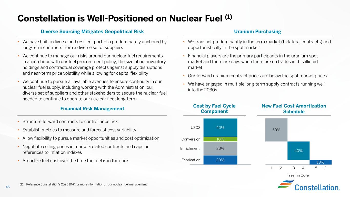 • We have built a diverse and resilient portfolio predominately anchored by long-term contracts from a diverse set of suppliers • We continue to manage our risks around our nuclear fuel requirements in accordance with our fuel procurement policy; the size of our inventory holdings and contractual coverage protects against supply disruptions and near-term price volatility while allowing for capital flexibility • We continue to pursue all available avenues to ensure continuity in our nuclear fuel supply, including working with the Administration, our diverse set of suppliers and other stakeholders to secure the nuclear fuel needed to continue to operate our nuclear fleet long-term • We transact predominantly in the term market (bi-lateral contracts) and opportunistically in the spot market • Financial players are the primary participants in the uranium spot market and there are days when there are no trades in this illiquid market • Our forward uranium contract prices are below the spot market prices • We have engaged in multiple long-term supply contracts running well into the 2030s Constellation is Well-Positioned on Nuclear Fuel (1) Uranium PurchasingDiverse Sourcing Mitigates Geopolitical Risk 20% 30% 10% 40%U3O8 Conversion Enrichment Fabrication 10% 40% 50% Year in Core 1 2 3 4 5 6 New Fuel Cost Amortization Schedule Cost by Fuel Cycle ComponentFinancial Risk Management 46 • Structure forward contracts to control price risk • Establish metrics to measure and forecast cost variability • Allow flexibility to pursue market opportunities and cost optimization • Negotiate ceiling prices in market-related contracts and caps on references to inflation indexes • Amortize fuel cost over the time the fuel is in the core (1) Reference Constellation’s 2025 10-K for more information on our nuclear fuel management