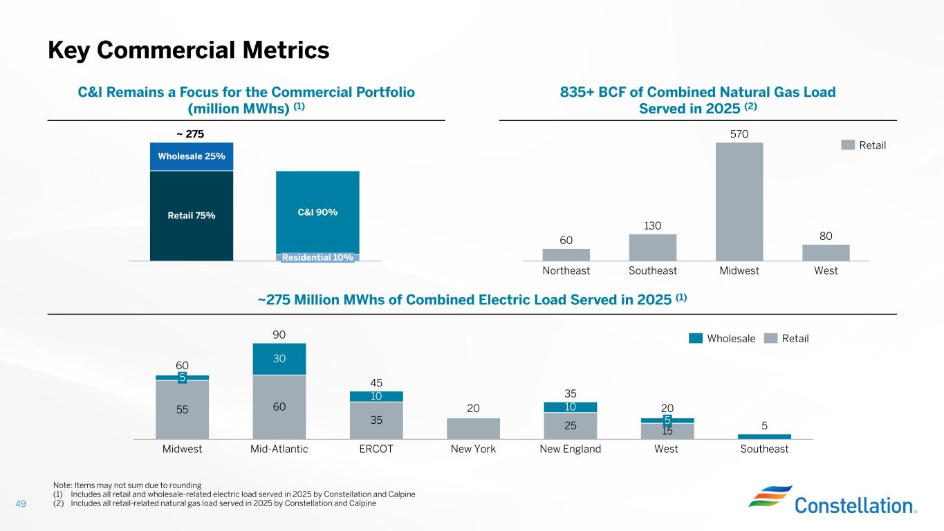 49 Key Commercial Metrics 60 130 570 80 Northeast Southeast Midwest West Retail 835+ BCF of Combined Natural Gas Load Served in 2025 (2) C&I Remains a Focus for the Commercial Portfolio (million MWhs) (1) Wholesale 25% Retail 75% C&I 90% Residential 10% ~ 275 Note: Items may not sum due to rounding (1) Includes all retail and wholesale-related electric load served in 2025 by Constellation and Calpine (2) Includes all retail-related natural gas load served in 2025 by Constellation and Calpine 55 60 35 20 25 15 30 10 10 5 Midwest Mid-Atlantic ERCOT New York New England 5 West Southeast 60 90 45 35 20 5 Wholesale Retail ~275 Million MWhs of Combined Electric Load Served in 2025 (1)