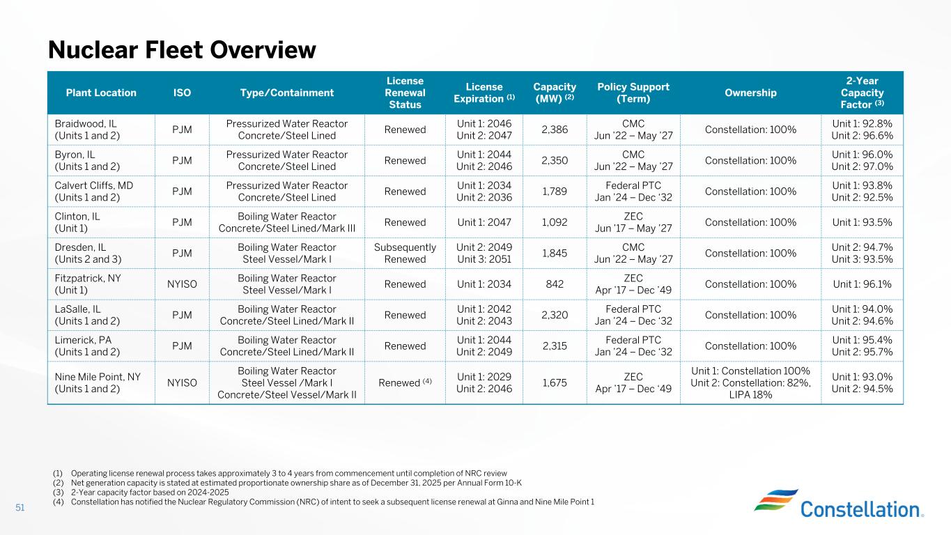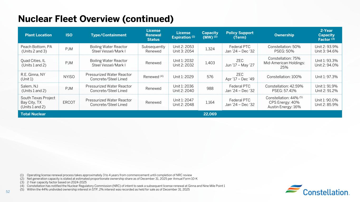 Nuclear Fleet Overview 51 2-Year Capacity Factor (3) Ownership Policy Support (Term) Capacity (MW) (2) License Expiration (1) License Renewal Status Type/ContainmentISOPlant Location Unit 1: 92.8% Unit 2: 96.6% Constellation: 100% CMC Jun ’22 – May ’27 2,386 Unit 1: 2046 Unit 2: 2047 Renewed Pressurized Water Reactor Concrete/Steel Lined PJM Braidwood, IL (Units 1 and 2) Unit 1: 96.0% Unit 2: 97.0% Constellation: 100% CMC Jun ’22 – May ’27 2,350 Unit 1: 2044 Unit 2: 2046 Renewed Pressurized Water Reactor Concrete/Steel Lined PJM Byron, IL (Units 1 and 2) Unit 1: 93.8% Unit 2: 92.5% Constellation: 100% Federal PTC Jan ’24 – Dec ‘32 1,789 Unit 1: 2034 Unit 2: 2036 Renewed Pressurized Water Reactor Concrete/Steel Lined PJM Calvert Cliffs, MD (Units 1 and 2) Unit 1: 93.5%Constellation: 100% ZEC Jun ’17 – May ’27 1,092Unit 1: 2047Renewed Boiling Water Reactor Concrete/Steel Lined/Mark III PJM Clinton, IL (Unit 1) Unit 2: 94.7% Unit 3: 93.5% Constellation: 100% CMC Jun ’22 – May ’27 1,845 Unit 2: 2049 Unit 3: 2051 Subsequently Renewed Boiling Water Reactor Steel Vessel/Mark I PJM Dresden, IL (Units 2 and 3) Unit 1: 96.1%Constellation: 100% ZEC Apr ’17 – Dec ’49 842Unit 1: 2034Renewed Boiling Water Reactor Steel Vessel/Mark I NYISO Fitzpatrick, NY (Unit 1) Unit 1: 94.0% Unit 2: 94.6% Constellation: 100% Federal PTC Jan ’24 – Dec ‘32 2,320 Unit 1: 2042 Unit 2: 2043 Renewed Boiling Water Reactor Concrete/Steel Lined/Mark II PJM LaSalle, IL (Units 1 and 2) Unit 1: 95.4% Unit 2: 95.7% Constellation: 100% Federal PTC Jan ’24 – Dec ‘32 2,315 Unit 1: 2044 Unit 2: 2049 Renewed Boiling Water Reactor Concrete/Steel Lined/Mark II PJM Limerick, PA (Units 1 and 2) Unit 1: 93.0% Unit 2: 94.5% Unit 1: Constellation 100% Unit 2: Constellation: 82%, LIPA 18% ZEC Apr ’17 – Dec ‘49 1,675 Unit 1: 2029 Unit 2: 2046 Renewed (4) Boiling Water Reactor Steel Vessel /Mark I Concrete/Steel Vessel/Mark II NYISO Nine Mile Point, NY (Units 1 and 2) (1) Operating license renewal process takes approximately 3 to 4 years from commencement until completion of NRC review (2) Net generation capacity is stated at estimated proportionate ownership share as of December 31, 2025 per Annual Form 10-K (3) 2-Year capacity factor based on 2024-2025 (4) Constellation has notified the Nuclear Regulatory Commission (NRC) of intent to seek a subsequent license renewal at Ginna and Nine Mile Point 1