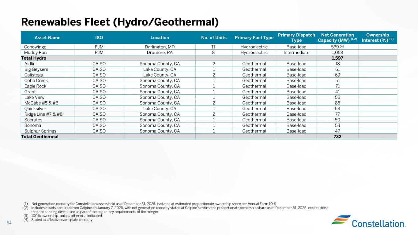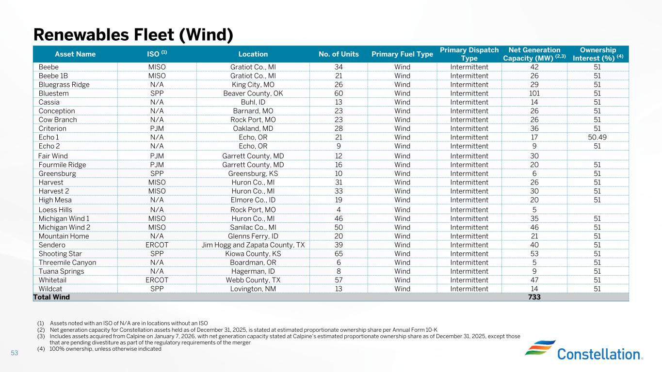Renewables Fleet (Wind) 53 Ownership Interest (%) (4) Net Generation Capacity (MW) (2,3) Primary Dispatch Type Primary Fuel TypeNo. of UnitsLocationISO (1)Asset Name 5142IntermittentWind34Gratiot Co., MIMISOBeebe 5126IntermittentWind21Gratiot Co., MIMISOBeebe 1B 5129IntermittentWind26King City, MON/ABluegrass Ridge 51101IntermittentWind60Beaver County, OKSPPBluestem 5114IntermittentWind13Buhl, IDN/ACassia 5126IntermittentWind23Barnard, MON/AConception 5126IntermittentWind23Rock Port, MON/ACow Branch 5136IntermittentWind28Oakland, MDPJMCriterion 50.4917IntermittentWind21Echo, ORN/AEcho 1 519IntermittentWind9Echo, ORN/AEcho 2 30IntermittentWind12Garrett County, MDPJMFair Wind 5120IntermittentWind16Garrett County, MDPJMFourmile Ridge 516IntermittentWind10Greensburg, KSSPPGreensburg 5126IntermittentWind31Huron Co., MIMISOHarvest 5130IntermittentWind33Huron Co., MIMISOHarvest 2 5120IntermittentWind19Elmore Co., IDN/AHigh Mesa 5IntermittentWind4Rock Port, MON/ALoess Hills 5135IntermittentWind46Huron Co., MIMISOMichigan Wind 1 5146IntermittentWind50Sanilac Co., MIMISOMichigan Wind 2 5121IntermittentWind20Glenns Ferry, IDN/AMountain Home 5140IntermittentWind39Jim Hogg and Zapata County, TXERCOTSendero 5153IntermittentWind65Kiowa County, KSSPPShooting Star 515IntermittentWind6Boardman, ORN/AThreemile Canyon 519IntermittentWind8Hagerman, IDN/ATuana Springs 5147IntermittentWind57Webb County, TXERCOTWhitetail 5114IntermittentWind13Lovington, NMSPPWildcat 733Total Wind (1) Assets noted with an ISO of N/A are in locations without an ISO (2) Net generation capacity for Constellation assets held as of December 31, 2025, is stated at estimated proportionate ownership share per Annual Form 10-K (3) Includes assets acquired from Calpine on January 7, 2026, with net generation capacity stated at Calpine’s estimated proportionate ownership share as of December 31, 2025, except those that are pending divestiture as part of the regulatory requirements of the merger (4) 100% ownership, unless otherwise indicated