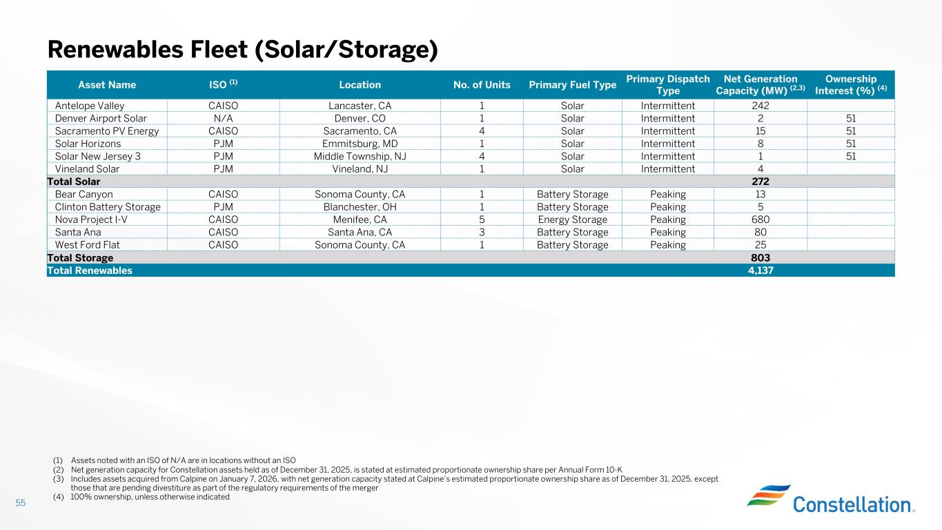 Renewables Fleet (Solar/Storage) 55 Ownership Interest (%) (4) Net Generation Capacity (MW) (2,3) Primary Dispatch Type Primary Fuel TypeNo. of UnitsLocationISO (1)Asset Name 242IntermittentSolar1Lancaster, CACAISOAntelope Valley 512IntermittentSolar1Denver, CON/ADenver Airport Solar 5115IntermittentSolar4Sacramento, CACAISOSacramento PV Energy 518IntermittentSolar1Emmitsburg, MDPJMSolar Horizons 511IntermittentSolar4Middle Township, NJPJMSolar New Jersey 3 4IntermittentSolar1Vineland, NJPJMVineland Solar 272Total Solar 13PeakingBattery Storage1Sonoma County, CACAISOBear Canyon 5PeakingBattery Storage1Blanchester, OHPJMClinton Battery Storage 680PeakingEnergy Storage5Menifee, CACAISONova Project I-V 80PeakingBattery Storage3Santa Ana, CACAISOSanta Ana 25PeakingBattery Storage1Sonoma County, CACAISOWest Ford Flat 803Total Storage 4,137Total Renewables (1) Assets noted with an ISO of N/A are in locations without an ISO (2) Net generation capacity for Constellation assets held as of December 31, 2025, is stated at estimated proportionate ownership share per Annual Form 10-K (3) Includes assets acquired from Calpine on January 7, 2026, with net generation capacity stated at Calpine’s estimated proportionate ownership share as of December 31, 2025, except those that are pending divestiture as part of the regulatory requirements of the merger (4) 100% ownership, unless otherwise indicated