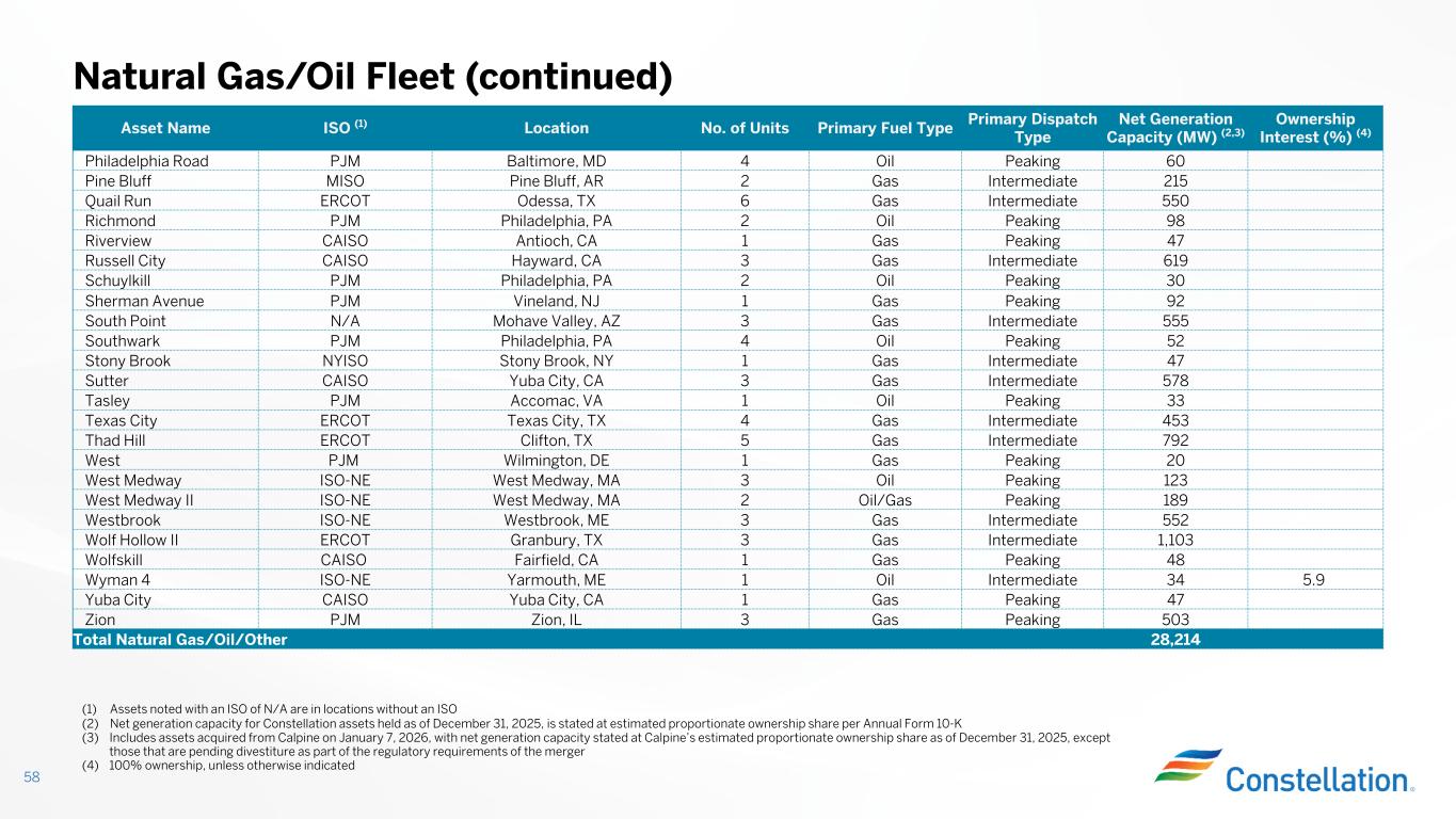 Natural Gas/Oil Fleet (continued) 57 Ownership Interest (%) (4) Net Generation Capacity (MW) (2,3) Primary Dispatch Type Primary Fuel TypeNo. of UnitsLocationISO (1)Asset Name 130IntermediateGas2Gilroy, CACAISOGilroy Cogeneration 47PeakingGas1Suisun City, CACAISOGoose Haven 105PeakingGas1Alberta, CanadaAESOGrand Prairie 695IntermediateGas3Londonderry, NHISO-NEGranite Ridge 1,088IntermediateGas4Ontario, CanadaIESOGreenfield 1,040IntermediateGas6New Braunfels, TXERCOTGuadalupe 375IntermediateGas1Fort Worth, TXERCOTHandley 3 870PeakingGas2Fort Worth, TXERCOTHandley 4, 5 268PeakingGas5Kennerdell, PAPJMHandsome Lake 635IntermediateGas3Hermiston, ORN/AHermiston 79395IntermediateGas3Edinburg, TXERCOTHidalgo 753IntermediateGas3Alexander City, ALN/AHillabee 120IntermediateGas2King City, CACAISOKing City Cogeneration 44PeakingGas1King City, CACAISOKing City Peaking 47PeakingGas1Suisun City, CACAISOLambie 309IntermediateGas5San Jose, CACAISOLos Esteros 572IntermediateGas3Pittsburg, CACAISOLos Medanos 712IntermediateGas3Edinburg, TXERCOTMagic Valley 625IntermediateGas3Coyote, CACAISOMetcalf 807IntermediateGas4Decatur, ALN/AMorgan 51PeakingOil3Lower Pottsgrove Twp., PAPJMMoser 608IntermediateGas3San Diego, CACAISOOtay Mesa 781IntermediateGas5Pasadena, TXERCOTPasadena 759IntermediateGas5Arvin, CACAISOPastoria 404PeakingOil/Gas5Aberdeen, MDPJMPerryman (1) Assets noted with an ISO of N/A are in locations without an ISO (2) Net generation capacity for Constellation assets held as of December 31, 2025, is stated at estimated proportionate ownership share per Annual Form 10-K (3) Includes assets acquired from Calpine on January 7, 2026, with net generation capacity stated at Calpine’s estimated proportionate ownership share as of December 31, 2025, except those that are pending divestiture as part of the regulatory requirements of the merger (4) 100% ownership, unless otherwise indicated