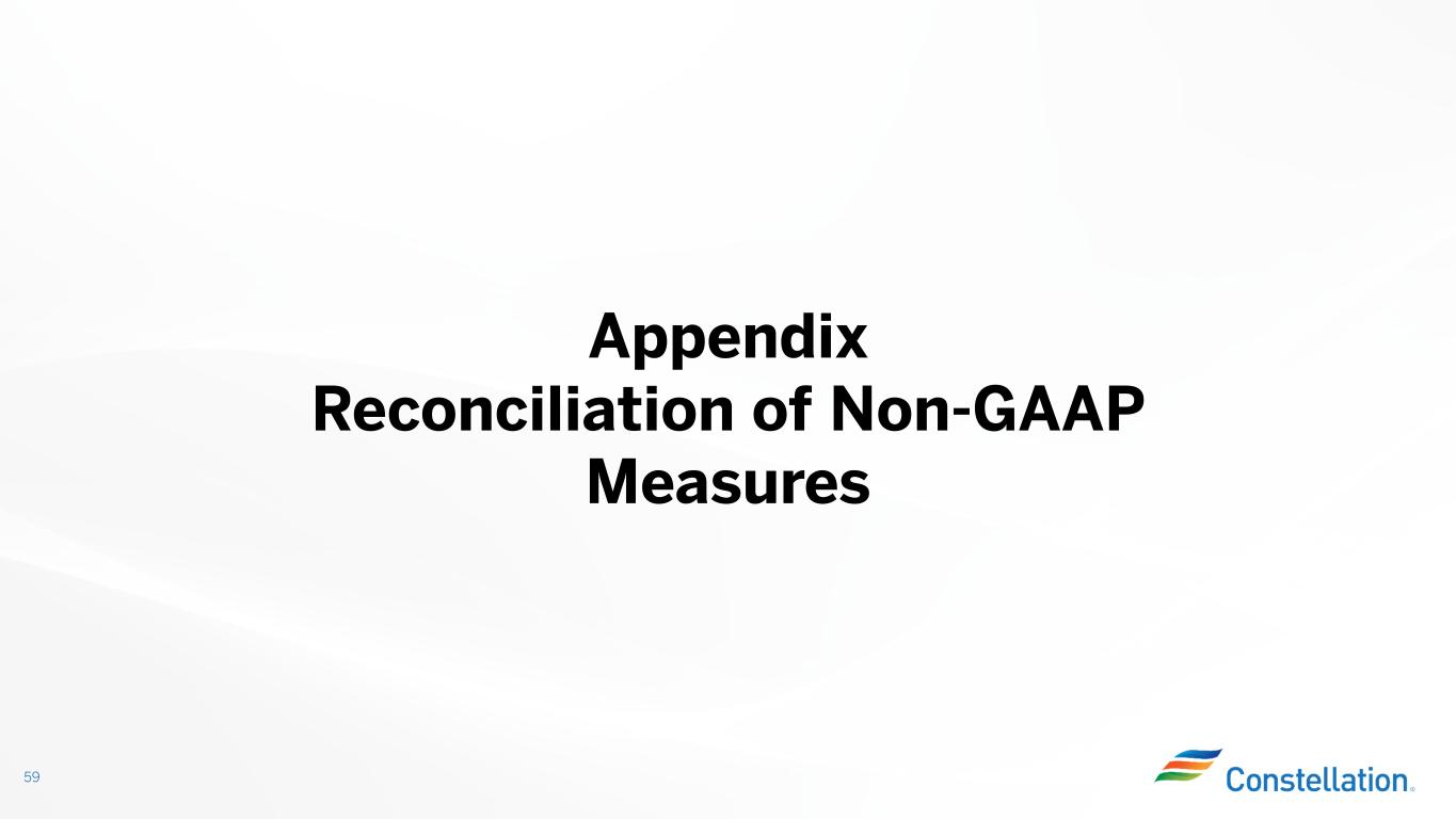 Natural Gas/Oil Fleet (continued) 58 Ownership Interest (%) (4) Net Generation Capacity (MW) (2,3) Primary Dispatch Type Primary Fuel TypeNo. of UnitsLocationISO (1)Asset Name 60PeakingOil4Baltimore, MDPJMPhiladelphia Road 215IntermediateGas2Pine Bluff, ARMISOPine Bluff 550IntermediateGas6Odessa, TXERCOTQuail Run 98PeakingOil2Philadelphia, PAPJMRichmond 47PeakingGas1Antioch, CACAISORiverview 619IntermediateGas3Hayward, CACAISORussell City 30PeakingOil2Philadelphia, PAPJMSchuylkill 92PeakingGas1Vineland, NJPJMSherman Avenue 555IntermediateGas3Mohave Valley, AZN/ASouth Point 52PeakingOil4Philadelphia, PAPJMSouthwark 47IntermediateGas1Stony Brook, NYNYISOStony Brook 578IntermediateGas3Yuba City, CACAISOSutter 33PeakingOil1Accomac, VAPJMTasley 453IntermediateGas4Texas City, TXERCOTTexas City 792IntermediateGas5Clifton, TXERCOTThad Hill 20PeakingGas1Wilmington, DEPJMWest 123PeakingOil3West Medway, MAISO-NEWest Medway 189PeakingOil/Gas2West Medway, MAISO-NEWest Medway II 552IntermediateGas3Westbrook, MEISO-NEWestbrook 1,103IntermediateGas3Granbury, TXERCOTWolf Hollow II 48PeakingGas1Fairfield, CACAISOWolfskill 5.934IntermediateOil1Yarmouth, MEISO-NEWyman 4 47PeakingGas1Yuba City, CACAISOYuba City 503PeakingGas3Zion, ILPJMZion 28,214Total Natural Gas/Oil/Other (1) Assets noted with an ISO of N/A are in locations without an ISO (2) Net generation capacity for Constellation assets held as of December 31, 2025, is stated at estimated proportionate ownership share per Annual Form 10-K (3) Includes assets acquired from Calpine on January 7, 2026, with net generation capacity stated at Calpine’s estimated proportionate ownership share as of December 31, 2025, except those that are pending divestiture as part of the regulatory requirements of the merger (4) 100% ownership, unless otherwise indicated