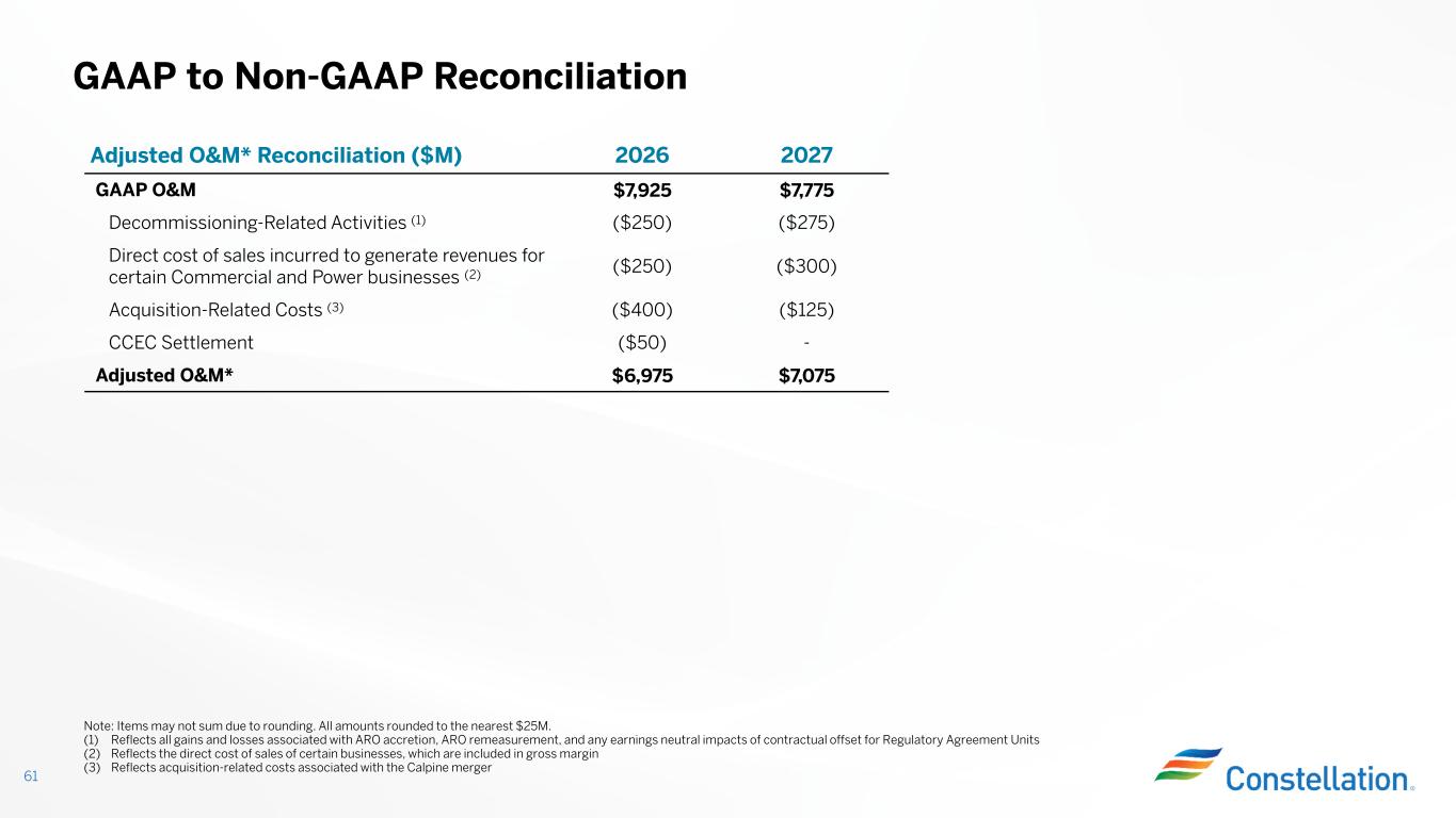 GAAP to Non-GAAP Reconciliation 61 20272026Adjusted O&M* Reconciliation ($M) $7,775$7,925GAAP O&M ($275)($250)Decommissioning-Related Activities (1) ($300)($250) Direct cost of sales incurred to generate revenues for certain Commercial and Power businesses (2) ($125)($400)Acquisition-Related Costs (3) -($50)CCEC Settlement $7,075$6,975Adjusted O&M* Note: Items may not sum due to rounding. All amounts rounded to the nearest $25M. (1) Reflects all gains and losses associated with ARO accretion, ARO remeasurement, and any earnings neutral impacts of contractual offset for Regulatory Agreement Units (2) Reflects the direct cost of sales of certain businesses, which are included in gross margin (3) Reflects acquisition-related costs associated with the Calpine merger