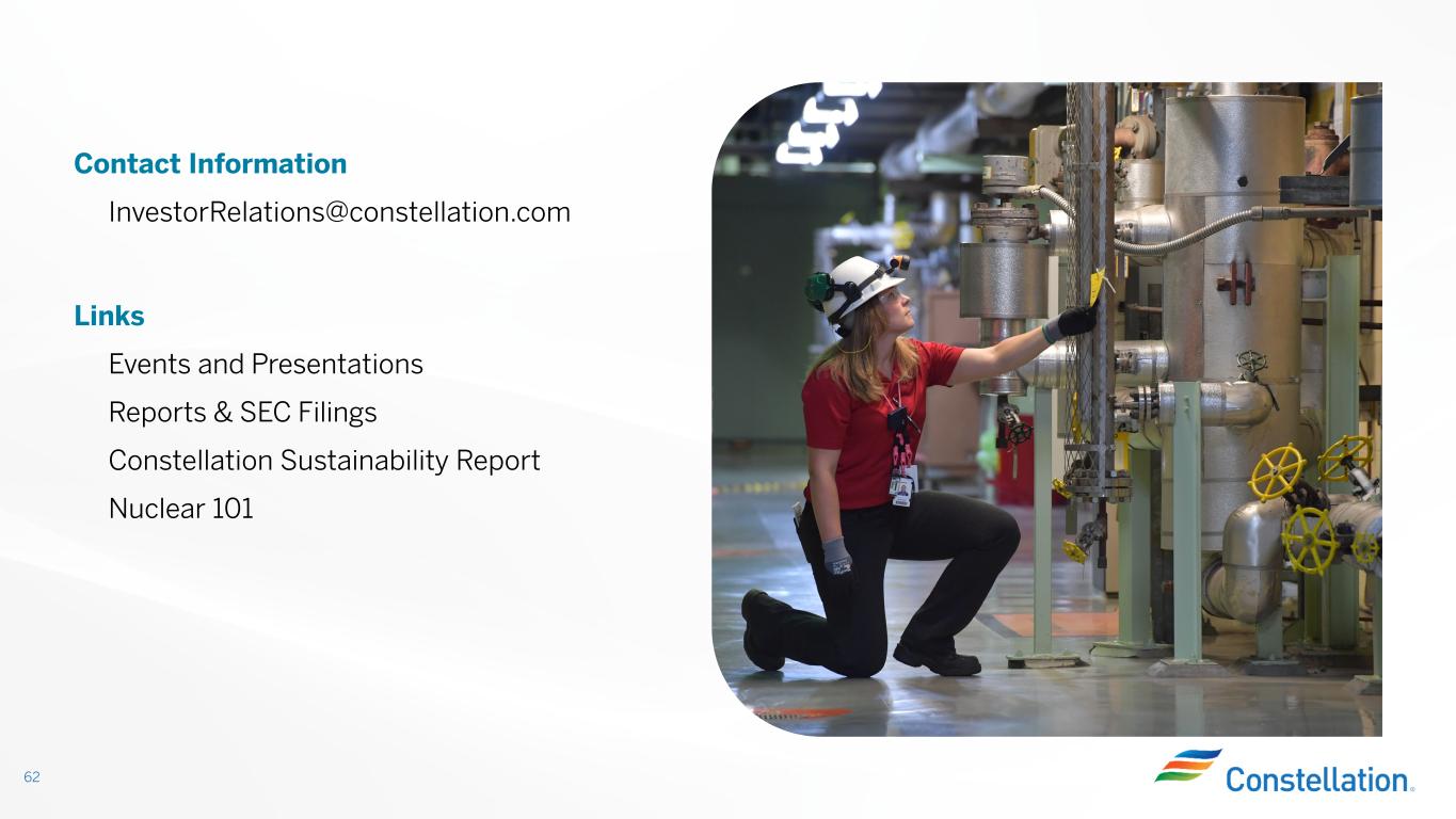 62 Contact Information InvestorRelations@constellation.com Links Events and Presentations Reports & SEC Filings Constellation Sustainability Report Nuclear 101