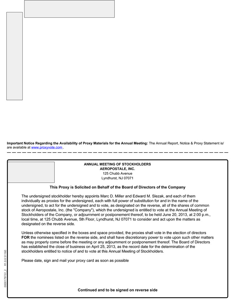 NOTICE IS HEREBY GIVEN that the Annual Meeting of Stockholders of Aéropostale, Inc., a Delaware corporation (the “Company”), will be held at the Company’s office at 125 Chubb Avenue, 5th Floor, Lyndhurst, New Jersey, 07071, on June 20, 2013 at 2:00 p.m., local time, for the following purposes: