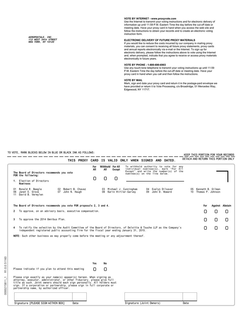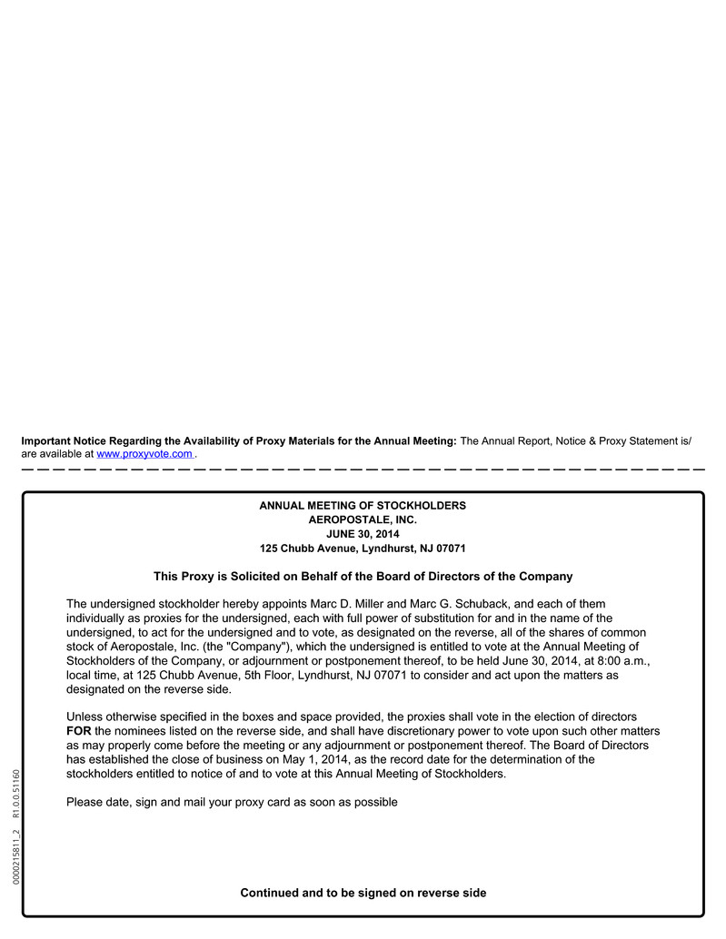 The Proxy Statement, the 2013 Annual Report to Stockholders and the Form 10-K of Aéropostale, Inc. for 2013 are available on the Investor Relations portion of the Company's website at www.aeropostale.com.