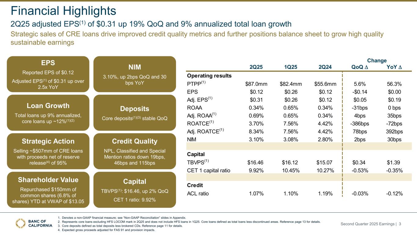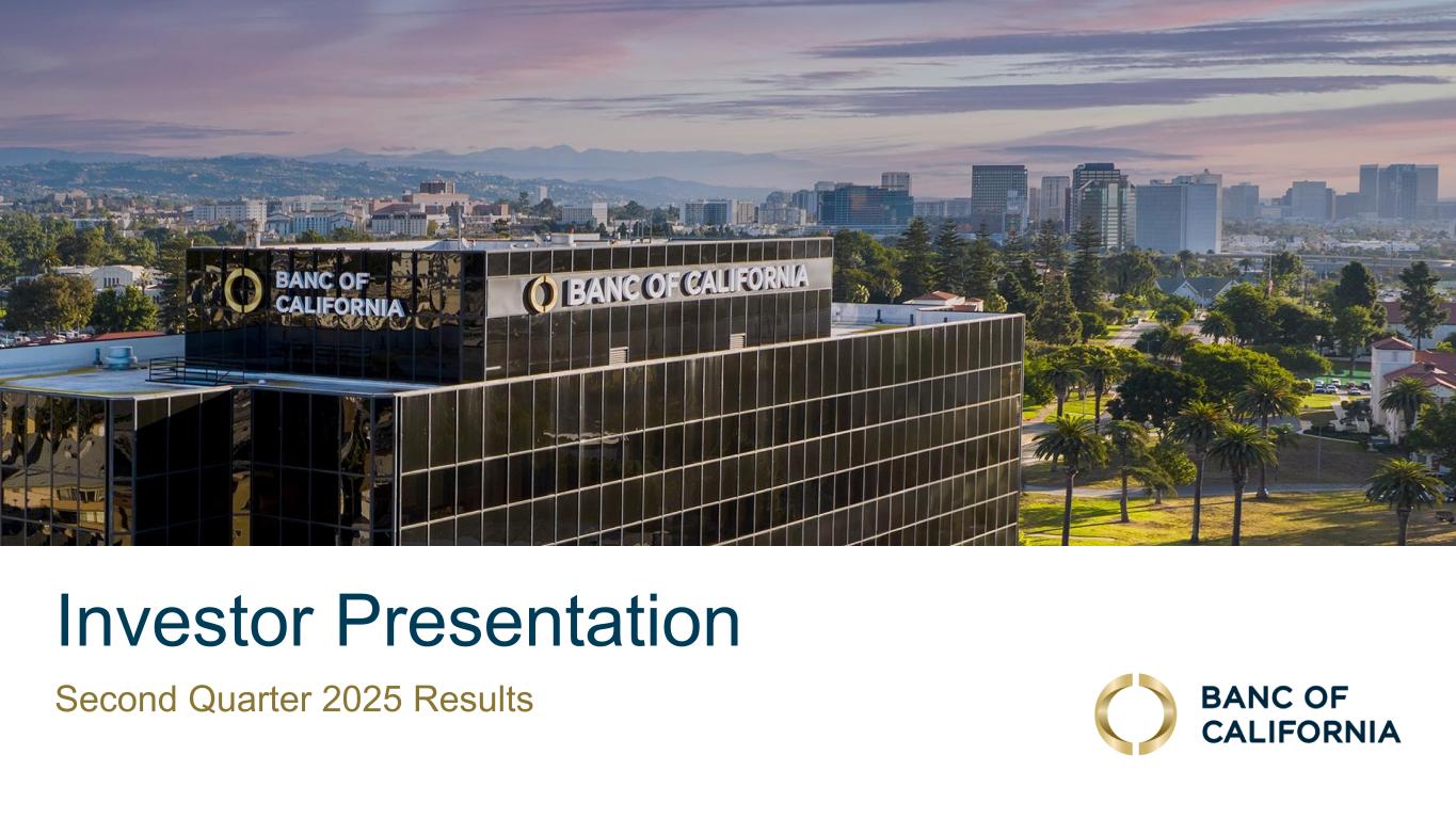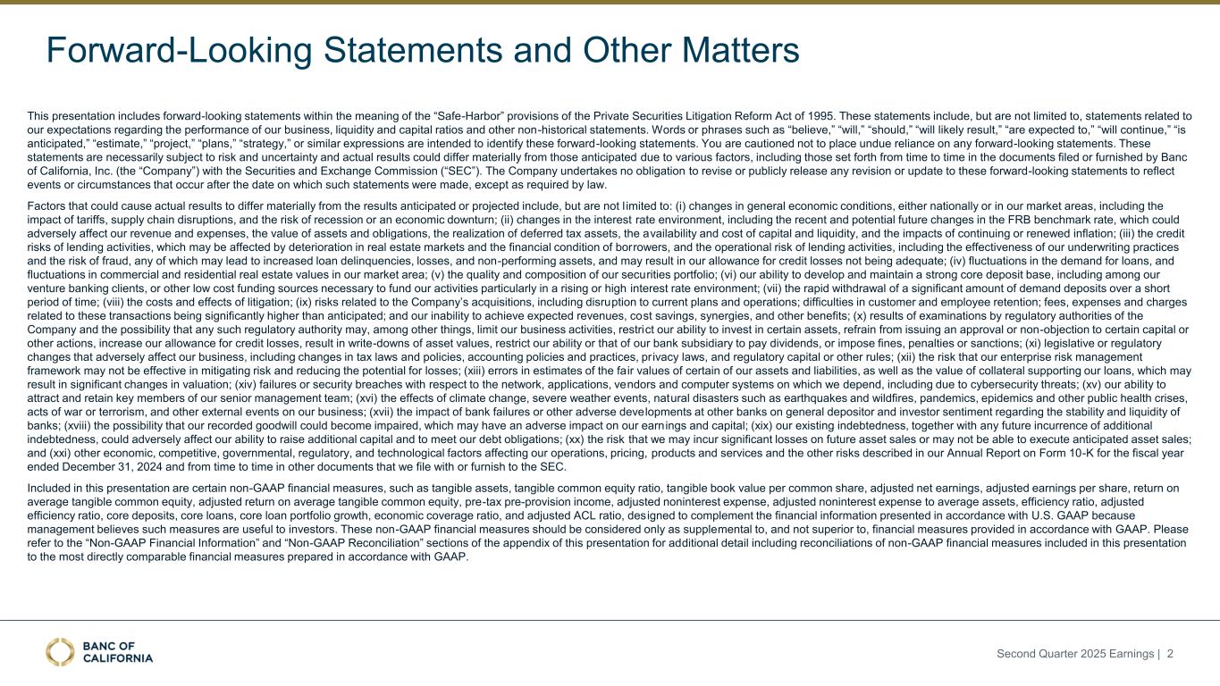 Forward-Looking Statements and Other Matters This presentation includes forward-looking statements within the meaning of the “Safe-Harbor” provisions of the Private Securities Litigation Reform Act of 1995. These statements include, but are not limited to, statements related to our expectations regarding the performance of our business, liquidity and capital ratios and other non-historical statements. Words or phrases such as “believe,” “will,” “should,” “will likely result,” “are expected to,” “will continue,” “is anticipated,” “estimate,” “project,” “plans,” “strategy,” or similar expressions are intended to identify these forward-looking statements. You are cautioned not to place undue reliance on any forward-looking statements. These statements are necessarily subject to risk and uncertainty and actual results could differ materially from those anticipated due to various factors, including those set forth from time to time in the documents filed or furnished by Banc of California, Inc. (the “Company”) with the Securities and Exchange Commission (“SEC”). The Company undertakes no obligation to revise or publicly release any revision or update to these forward-looking statements to reflect events or circumstances that occur after the date on which such statements were made, except as required by law. Factors that could cause actual results to differ materially from the results anticipated or projected include, but are not l imited to: (i) changes in general economic conditions, either nationally or in our market areas, including the impact of tariffs, supply chain disruptions, and the risk of recession or an economic downturn; (ii) changes in the interest rate environment, including the recent and potential future changes in the FRB benchmark rate, which could adversely affect our revenue and expenses, the value of assets and obligations, the realization of deferred tax assets, the availability and cost of capital and liquidity, and the impacts of continuing or renewed inflation; (iii) the credit risks of lending activities, which may be affected by deterioration in real estate markets and the financial condition of borrowers, and the operational risk of lending activities, including the effectiveness of our underwriting practices and the risk of fraud, any of which may lead to increased loan delinquencies, losses, and non-performing assets, and may result in our allowance for credit losses not being adequate; (iv) fluctuations in the demand for loans, and fluctuations in commercial and residential real estate values in our market area; (v) the quality and composition of our securities portfolio; (vi) our ability to develop and maintain a strong core deposit base, including among our venture banking clients, or other low cost funding sources necessary to fund our activities particularly in a rising or high interest rate environment; (vii) the rapid withdrawal of a significant amount of demand deposits over a short period of time; (viii) the costs and effects of litigation; (ix) risks related to the Company’s acquisitions, including disruption to current plans and operations; difficulties in customer and employee retention; fees, expenses and charges related to these transactions being significantly higher than anticipated; and our inability to achieve expected revenues, cost savings, synergies, and other benefits; (x) results of examinations by regulatory authorities of the Company and the possibility that any such regulatory authority may, among other things, limit our business activities, restrict our ability to invest in certain assets, refrain from issuing an approval or non-objection to certain capital or other actions, increase our allowance for credit losses, result in write-downs of asset values, restrict our ability or that of our bank subsidiary to pay dividends, or impose fines, penalties or sanctions; (xi) legislative or regulatory changes that adversely affect our business, including changes in tax laws and policies, accounting policies and practices, privacy laws, and regulatory capital or other rules; (xii) the risk that our enterprise risk management framework may not be effective in mitigating risk and reducing the potential for losses; (xiii) errors in estimates of the fair values of certain of our assets and liabilities, as well as the value of collateral supporting our loans, which may result in significant changes in valuation; (xiv) failures or security breaches with respect to the network, applications, vendors and computer systems on which we depend, including due to cybersecurity threats; (xv) our ability to attract and retain key members of our senior management team; (xvi) the effects of climate change, severe weather events, natural disasters such as earthquakes and wildfires, pandemics, epidemics and other public health crises, acts of war or terrorism, and other external events on our business; (xvii) the impact of bank failures or other adverse developments at other banks on general depositor and investor sentiment regarding the stability and liquidity of banks; (xviii) the possibility that our recorded goodwill could become impaired, which may have an adverse impact on our earnings and capital; (xix) our existing indebtedness, together with any future incurrence of additional indebtedness, could adversely affect our ability to raise additional capital and to meet our debt obligations; (xx) the risk that we may incur significant losses on future asset sales or may not be able to execute anticipated asset sales; and (xxi) other economic, competitive, governmental, regulatory, and technological factors affecting our operations, pricing, products and services and the other risks described in our Annual Report on Form 10-K for the fiscal year ended December 31, 2024 and from time to time in other documents that we file with or furnish to the SEC. Included in this presentation are certain non-GAAP finan