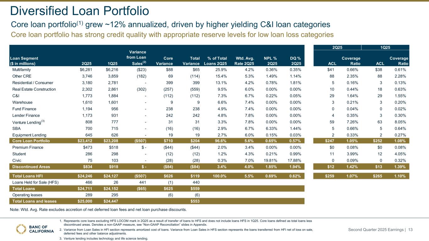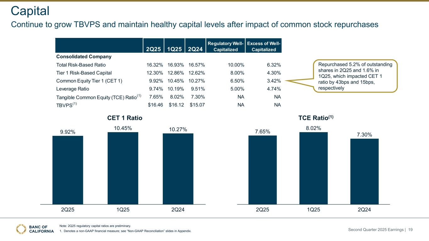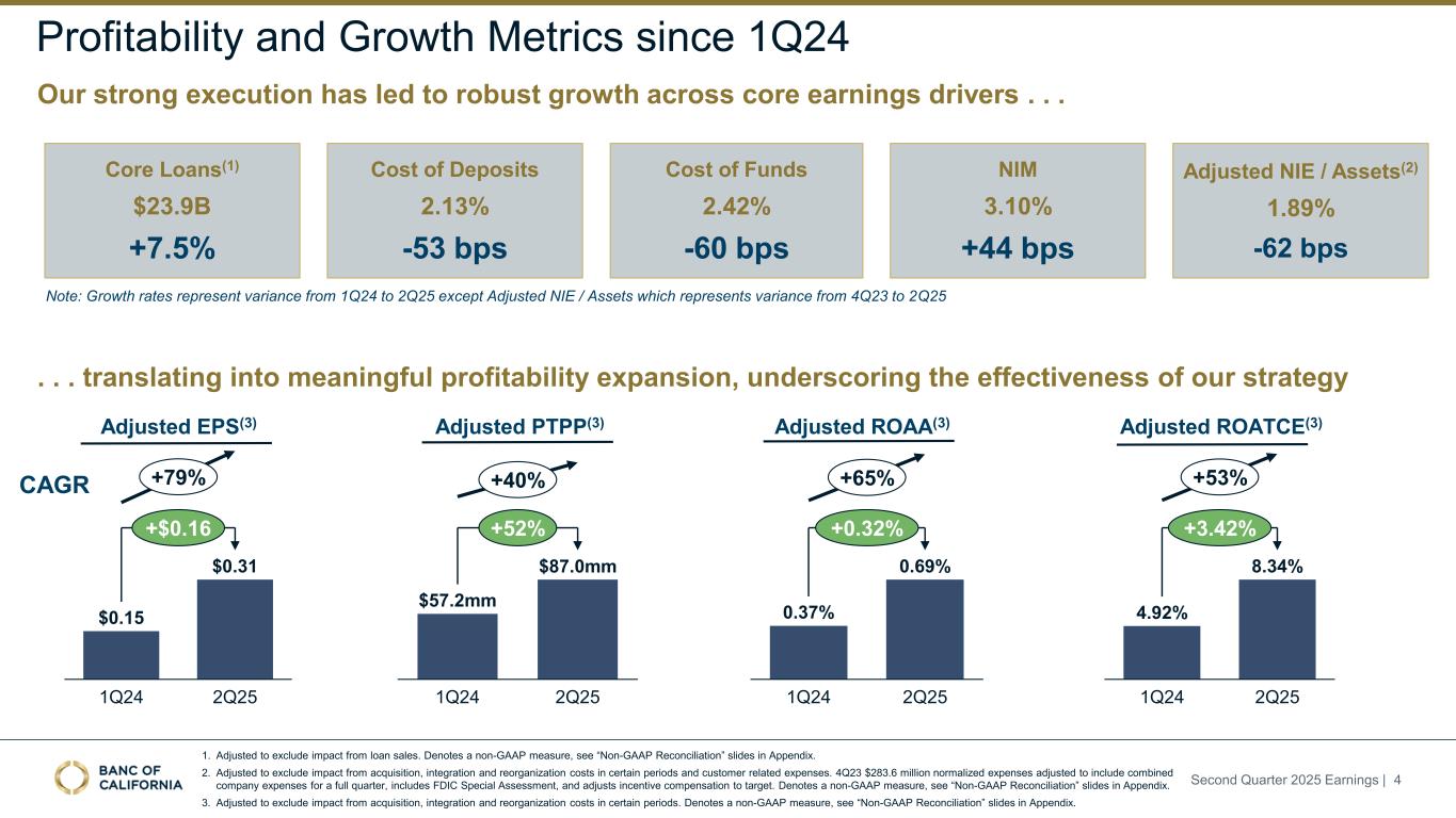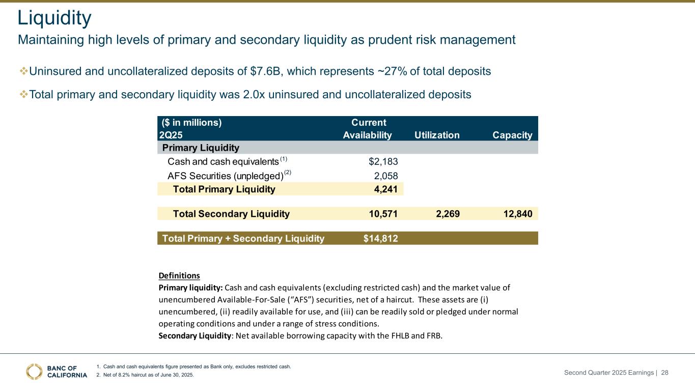 Forward-Looking Statements and Other Matters This presentation includes forward-looking statements within the meaning of the “Safe-Harbor” provisions of the Private Securities Litigation Reform Act of 1995. These statements include, but are not limited to, statements related to our expectations regarding the performance of our business, liquidity and capital ratios and other non-historical statements. Words or phrases such as “believe,” “will,” “should,” “will likely result,” “are expected to,” “will continue,” “is anticipated,” “estimate,” “project,” “plans,” “strategy,” or similar expressions are intended to identify these forward-looking statements. You are cautioned not to place undue reliance on any forward-looking statements. These statements are necessarily subject to risk and uncertainty and actual results could differ materially from those anticipated due to various factors, including those set forth from time to time in the documents filed or furnished by Banc of California, Inc. (the “Company”) with the Securities and Exchange Commission (“SEC”). The Company undertakes no obligation to revise or publicly release any revision or update to these forward-looking statements to reflect events or circumstances that occur after the date on which such statements were made, except as required by law. Factors that could cause actual results to differ materially from the results anticipated or projected include, but are not l imited to: (i) changes in general economic conditions, either nationally or in our market areas, including the impact of tariffs, supply chain disruptions, and the risk of recession or an economic downturn; (ii) changes in the interest rate environment, including the recent and potential future changes in the FRB benchmark rate, which could adversely affect our revenue and expenses, the value of assets and obligations, the realization of deferred tax assets, the availability and cost of capital and liquidity, and the impacts of continuing or renewed inflation; (iii) the credit risks of lending activities, which may be affected by deterioration in real estate markets and the financial condition of borrowers, and the operational risk of lending activities, including the effectiveness of our underwriting practices and the risk of fraud, any of which may lead to increased loan delinquencies, losses, and non-performing assets, and may result in our allowance for credit losses not being adequate; (iv) fluctuations in the demand for loans, and fluctuations in commercial and residential real estate values in our market area; (v) the quality and composition of our securities portfolio; (vi) our ability to develop and maintain a strong core deposit base, including among our venture banking clients, or other low cost funding sources necessary to fund our activities particularly in a rising or high interest rate environment; (vii) the rapid withdrawal of a significant amount of demand deposits over a short period of time; (viii) the costs and effects of litigation; (ix) risks related to the Company’s acquisitions, including disruption to current plans and operations; difficulties in customer and employee retention; fees, expenses and charges related to these transactions being significantly higher than anticipated; and our inability to achieve expected revenues, cost savings, synergies, and other benefits; (x) results of examinations by regulatory authorities of the Company and the possibility that any such regulatory authority may, among other things, limit our business activities, restrict our ability to invest in certain assets, refrain from issuing an approval or non-objection to certain capital or other actions, increase our allowance for credit losses, result in write-downs of asset values, restrict our ability or that of our bank subsidiary to pay dividends, or impose fines, penalties or sanctions; (xi) legislative or regulatory changes that adversely affect our business, including changes in tax laws and policies, accounting policies and practices, privacy laws, and regulatory capital or other rules; (xii) the risk that our enterprise risk management framework may not be effective in mitigating risk and reducing the potential for losses; (xiii) errors in estimates of the fair values of certain of our assets and liabilities, as well as the value of collateral supporting our loans, which may result in significant changes in valuation; (xiv) failures or security breaches with respect to the network, applications, vendors and computer systems on which we depend, including due to cybersecurity threats; (xv) our ability to attract and retain key members of our senior management team; (xvi) the effects of climate change, severe weather events, natural disasters such as earthquakes and wildfires, pandemics, epidemics and other public health crises, acts of war or terrorism, and other external events on our business; (xvii) the impact of bank failures or other adverse developments at other banks on general depositor and investor sentiment regarding the stability and liquidity of banks; (xviii) the possibility that our recorded goodwill could become impaired, which may have an adverse impact on our earnings and capital; (xix) our existing indebtedness, together with any future incurrence of additional indebtedness, could adversely affect our ability to raise additional capital and to meet our debt obligations; (xx) the risk that we may incur significant losses on future asset sales or may not be able to execute anticipated asset sales; and (xxi) other economic, competitive, governmental, regulatory, and technological factors affecting our operations, pricing, products and services and the other risks described in our Annual Report on Form 10-K for the fiscal year ended December 31, 2024 and from time to time in other documents that we file with or furnish to the SEC. Included in this presentation are certain non-GAAP finan
