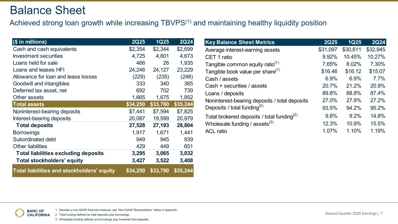 1. Denotes a non-GAAP financial measure; see “Non-GAAP Reconciliation” slides in Appendix. Strong PTPP(1) growth of 6% QoQ and 56% YoY driven by higher NII, NIM expansion and continued expense discipline Income Statement ($ in millions) 2Q25 1Q25 2Q24 Total interest income $420.5 $406.7 $462.6 Total interest expense 180.3 174.3 233.1 Net interest income 240.2 232.4 229.5 Other noninterest income 32.6 33.4 28.7 Gain on sales of securities and loans 0.0 0.2 1.1 Total noninterest income 32.6 33.7 29.8 Total revenue 272.8 266.0 259.3 Operating expense 185.9 183.7 216.3 Acquisition-related costs 0.0 0.0 (12.7) Total noninterest expense 185.9 183.7 203.6 PTPP income(1) 87.0 82.4 55.6 Provision for credit losses 39.1 9.3 11.0 EBIT 47.9 73.1 44.6 Income tax expense 19.5 19.5 14.3 Net earnings 28.4 53.6 30.3 Preferred stock dividends 9.9 9.9 9.9 Net earnings available to common and equivalent stockholders $18.4 $43.6 $20.4 Second Quarter 2025 Earnings | 6 Key Income Statement Metrics 2Q25 1Q25 2Q24 Adj. EPS(1) $0.31 $0.26 $0.12 Adj. ROAA(1) 0.69% 0.65% 0.34% Adj. ROATCE(1) 8.34% 7.56% 4.42% Net interest margin 3.10% 3.08% 2.80% NIE / average assets 2.21% 2.24% 2.29% Adj. NIE / average assets(1) 1.89% 1.90% 2.06% Efficiency ratio(1) 65.5% 66.4% 80.2% Adj. efficiency ratio(1) 61.8% 62.4% 77.3% Average loan yield 5.93% 5.90% 6.18% Average interest-earning assets yield 5.42% 5.39% 5.65% Average total cost of funds 2.42% 2.42% 2.95% Average total cost of deposits 2.13% 2.12% 2.60% 1Q25 2Q25 3.08% 3.10% 1Q25 2Q25 2.42% 2.42% 0 bps -32 bps 5.39% 5.42% 1Q25 2Q25 -27 bps + +3 Average interest-earning assets yield Average cost of funds Net interest margin