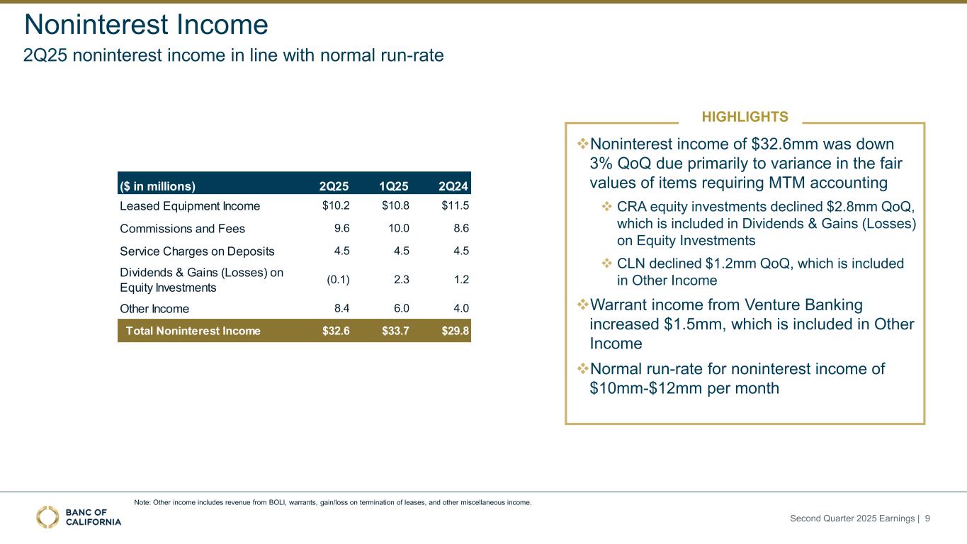 Net Interest Income (NII) ($mm) and Net Interest Margin (NIM) (%) Impact to NII ($mm) from cumulative change in yields, rates and mix 1Q25 +$16.2 Loans -$0.2 Securities -$1.6 Borrowings -$2.1 Cash / Other EA Deposits 2Q25 $232.4 -$4.4 $240.2 2.80% $229.5 2Q24 2.93% $232.2 3Q24 3.04% $235.3 4Q24 3.08% $232.4 1Q25 3.10% $240.2 2Q25 Net interest income up 3% QoQ, driven by interest income from strong loan growth Net Interest Income and Net Interest Margin NII increased $7.9mm, or 3.4% QoQ Second Quarter 2025 Earnings | 8 Strong loan growth drove mix shift to higher percentage of interest-bearing depositsStrong growth in higher yielding C&I loan categories NIM increased 30bps YoY