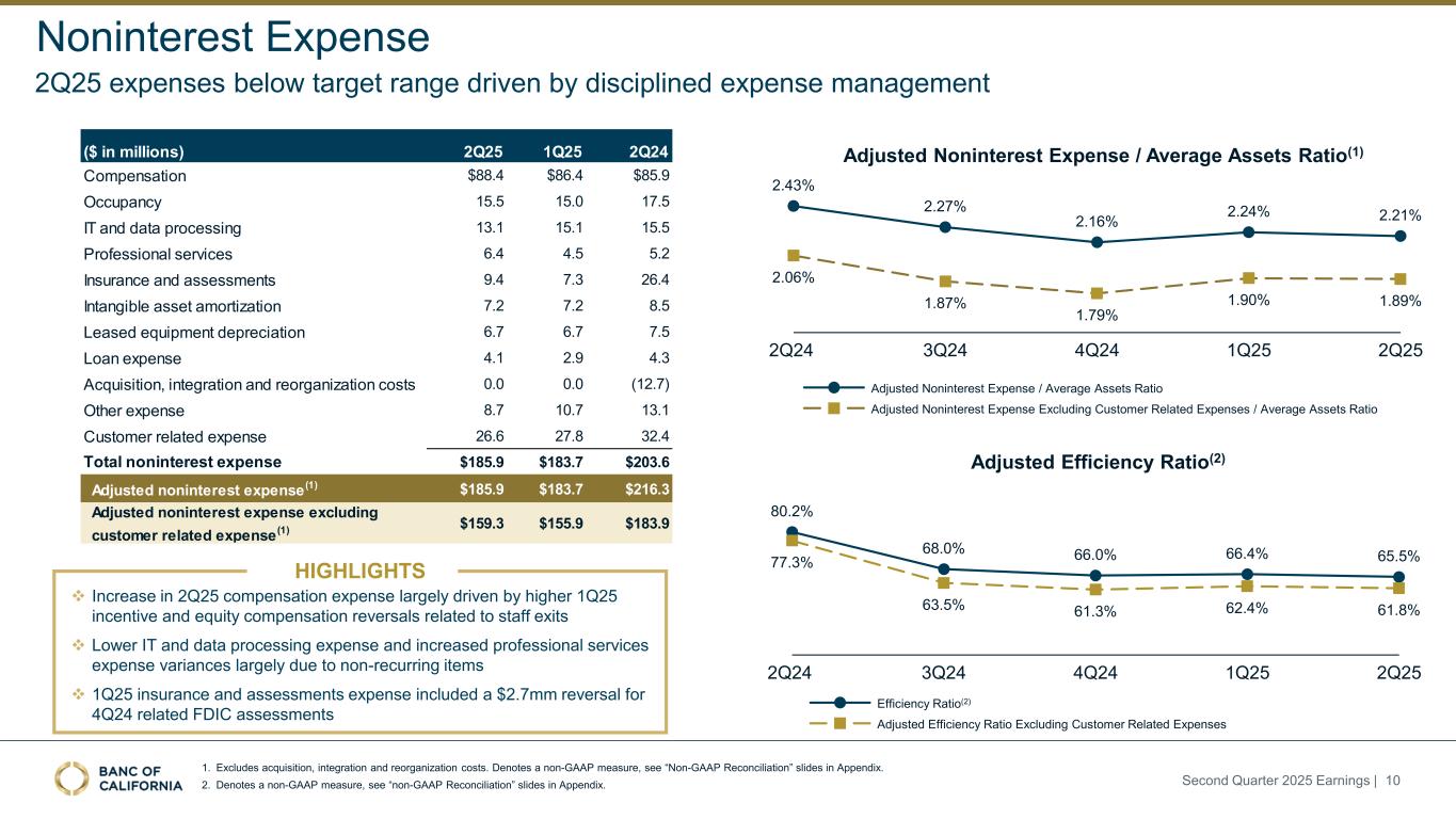 Note: Other income includes revenue from BOLI, warrants, gain/loss on termination of leases, and other miscellaneous income. Noninterest Income 2Q25 noninterest income in line with normal run-rate Second Quarter 2025 Earnings | 9 HIGHLIGHTS ❖Noninterest income of $32.6mm was down 3% QoQ due primarily to variance in the fair values of items requiring MTM accounting ❖ CRA equity investments declined $2.8mm QoQ, which is included in Dividends & Gains (Losses) on Equity Investments ❖ CLN declined $1.2mm QoQ, which is included in Other Income ❖Warrant income from Venture Banking increased $1.5mm, which is included in Other Income ❖Normal run-rate for noninterest income of $10mm-$12mm per month ($ in millions) 2Q25 1Q25 2Q24 Leased Equipment Income $10.2 $10.8 $11.5 Commissions and Fees 9.6 10.0 8.6 Service Charges on Deposits 4.5 4.5 4.5 Dividends & Gains (Losses) on Equity Investments (0.1) 2.3 1.2 Other Income 8.4 6.0 4.0 Total Noninterest Income $32.6 $33.7 $29.8