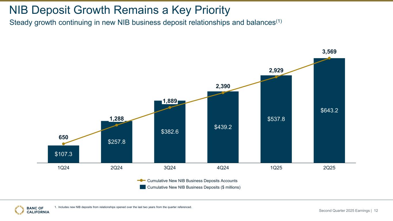 Deposits Core deposit(1) balances and cost of deposits remained stable 5.33% 5.26% 4.65% 4.33% 4.33% 2.60% 2.54% 2.26% 2.12% 2.13% Average Fed Funds Rate Average Total Cost of Deposits 27.2% 29.1% 28.4% 27.9% 27.0% 25.4% 28.1% 28.0% 28.5% 29.0% 23.9% 26.2% 26.8% 27.1% 26.5% 14.0% 7.4% 7.6% 7.3% 8.4% 9.6% 9.1% 9.2% 9.2% 9.1% 2Q24 3Q24 4Q24 1Q25 2Q25 CDs Brokered CDs Money Market & Savings Interest-bearing Checking Noninterest-bearing Checking 1. Denotes a non-GAAP measure, see “non-GAAP Reconciliation” slides in Appendix. 2. Costs do not include ECR expenses related to HOA deposits. 3. Includes brokered CDs. Second Quarter 2025 Earnings | 11 ($ in millions) 2Q25 1Q25 2Q24 Noninterest-bearing Checking $7,441 $7,594 $7,825 Checking 7,974 7,747 7,310 MMDA 5,375 5,368 4,837 Savings 1,933 1,999 2,040 Non-Brokered CDs 2,493 2,491 2,758 Core Deposits (1) $25,216 $25,198 $24,770 Brokered CDs 2,312 1,995 4,034 Total Deposits $27,528 $27,193 $28,804 Average Noninterest-bearing Checking 7,584 7,715 7,882 Average NIB Checking / Average Deposits 27.8% 28.7% 27.4% Deposits By Line of Business ($mm) 2Q25 Balance 2Q25 Cost 1Q25 Balance 1Q25 Cost Community Banking $14,457 1.72% $14,687 1.78% Venture 5,722 2.68% 5,714 2.75% Specialty Banking (includes HOA)(2) 4,021 0.79% 3,951 0.83% Corporate and Other Institutional(3) 3,329 3.89% 2,842 4.37% Total Deposits $27,528 2.13% $27,193 2.12% ❖NIB decline QoQ driven by 2% decline in average account balances ❖Total cost of deposits driven by mix shift towards IB deposits (up 2.5%), offset by lower total IB deposit rates (down 2bps)