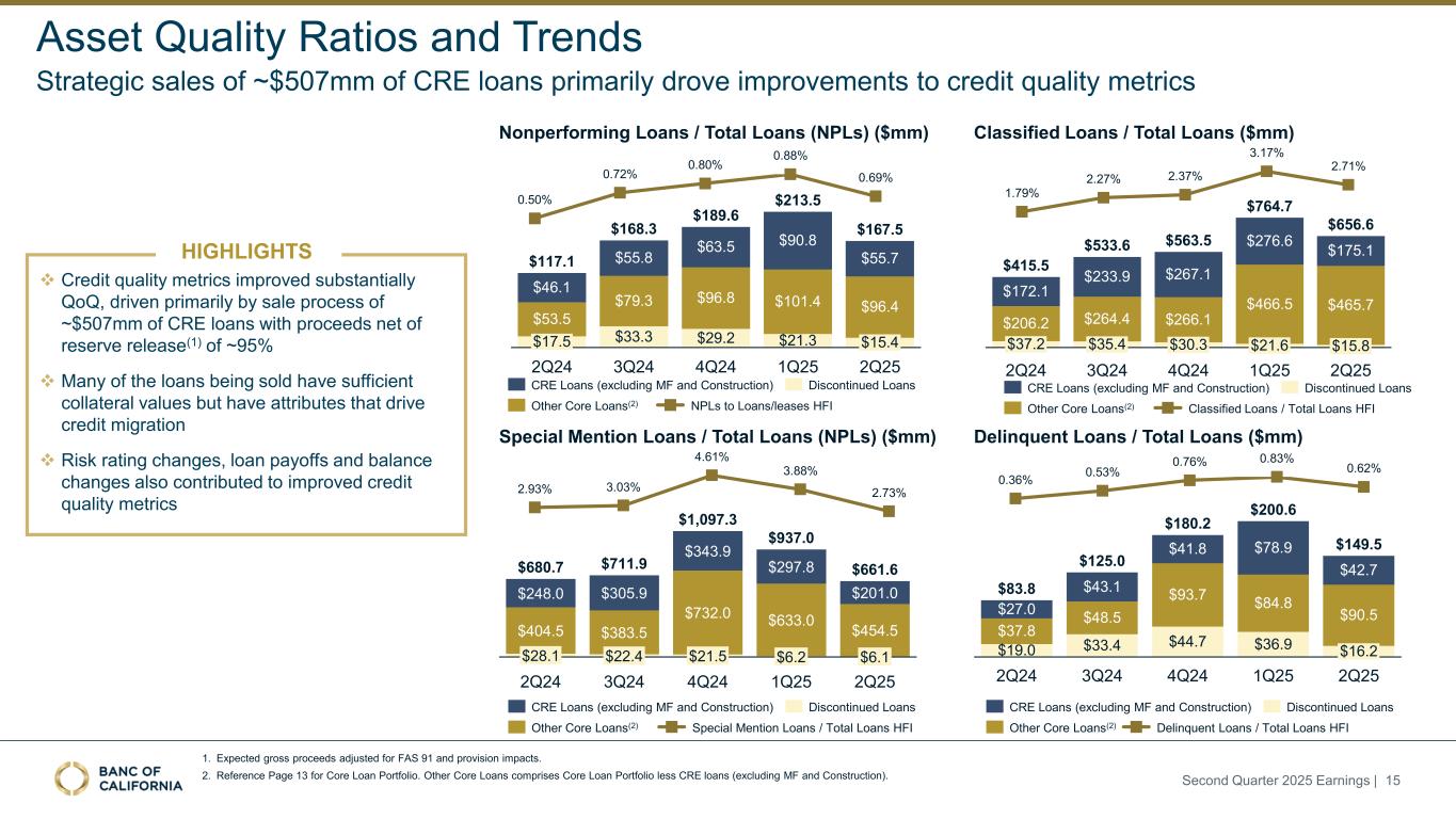 $1,076 $832 $659 $803 $1,257 $747 $1,063 $867 $990 $826 $1,908 $1,462 $2,004 $1,931 $1,816 7.80% 8.29% 7.00% 7.20% 7.29% 6.18% 6.18% 5.90% 5.93% 6.01% Rate on Production Total Loan Yield ($ in millions) 1. 1Q25 loan activity data has been adjusted to reflect more precise information with no impact to the Net Change or the Loan Production for the quarter. 2. Includes charge-offs, transfers to foreclosed assets, loan sales, and transfers to HFS. Loan Activity Strong loan production of $1.2B and increase in production coupon rates Rate on production reflects growth in lender finance, fund finance and SFR Loan yield increase QoQ due to mix shift in higher yield loan segments Second Quarter 2025 Earnings | 14 $382 $1,271 $700 $1,082 $937 $1,353 $924 $1,371 $1,177 $1,282 $1,654 $1,781 $2,290 $2,294 $2,459 2Q24 3Q24 4Q24 1Q25(1) 2Q25 $698 $852 $830 $1,197 $997 Loan Production Line Utilization Payoffs PaydownsUnfunded New Commitments ($ in millions) Loans Beginning Balance Total Production/ Disbursements Total Payoffs/ Paydowns Net Change Other Change(2) Loans Ending Balance Total Loan Yield Rate on Production C&I Utilization Rate 2Q25 $24,127 $2,459 $1,816 $643 ($524) $24,246 5.93% 7.29% 64.8% 1Q25 23,782 2,294 1,931 364 (19) 24,127 5.90% 7.20% 63.6% 4Q24 23,528 2,290 2,004 286 (32) 23,782 6.01% 7.00% 62.0% 3Q24 23,229 1,781 1,462 320 (21) 23,528 6.18% 8.29% 60.1% 2Q24 25,473 1,654 1,908 (255) (1,989) 23,229 6.18% 7.80% 58.5% (1) (1)