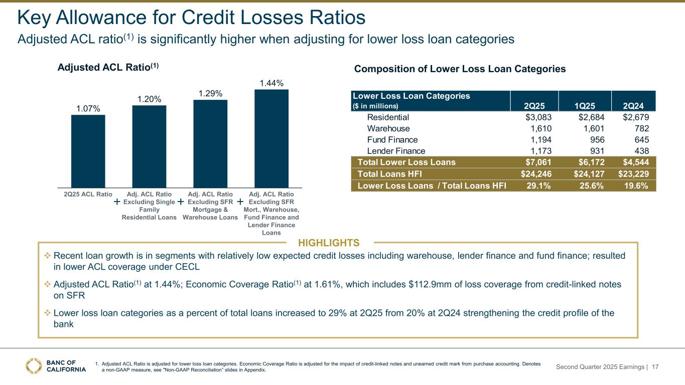❖ ACL decreased $6.0mm driven by: ❖ NCOs of $44.2mm include $36.9mm related to loan sales / transfers to HFS ❖ Provision of $38.2mm includes $26.3mm related to loan sales / transfers to HFS ❖ Core provision for credit losses of $12.3mm • Increased reserves to reflect updated economic forecast and added qualitative reserves related to office loans ❖ ACL coverage ratio at 1.07% ❖ Economic coverage ratio remains healthy at 1.61%(1) ($ in millions) 2Q25 net charge-offs detail $264.6 ($44.2) $38.2 ACL 1Q25 Net Charge-Offs Provision for Loans HFI ACL 2Q25 Allowance for Credit Losses – Loans ACL coverage ratio at appropriate level under CECL given portfolio mix and loss rates; additional credit protection enhances total economic coverage HIGHLIGHTS 1. Economic coverage ratio adjusts our ACL coverage ratio to include the loss coverage from credit-linked notes and unearned credit marks from purchase accounting. Denotes a non-GAAP measure, see "Non-GAAP Reconciliation” slides in Appendix. 1.61% Economic coverage ratio(1) $258.6 Second Quarter 2025 Earnings | 16 $275.3 1.19% 1.83% 2Q24 $281.9 1.20% 3Q24 $268.4 1.13% 1.72% 4Q24 $264.6 1.10% 1.66% 1Q25 $258.6 1.07% 1.61% 2Q25 1.82% ACL ACL / Total Loans HFI Economic Coverage Ratio(1) ACL / total loans ($mm) 2Q25 ACL walk Net Charge-offs ($ in millions) Charge-offs Recoveries Net Charge- offs % of Total Loans (annualized) Civic Loans $0.4 ($0.0) $0.4 0.01% Commercial Loans 8.8 (2.3) 6.5 0.11% Real Estate Mortgage 15.5 (0.3) 15.2 0.25% Real Estate Construction 21.5 - 21.5 0.35% Consumer Loans: Student Loans 0.7 (0.1) 0.6 0.01% Consumer Loans: excluding Student Loans 0.1 (0.1) (0.0) 0.00% Total $46.9 ($2.7) $44.2 0.72% Charge-offs related to loan sale process ($36.9) $ - ($36.9) -0.60% Total adjusted for loan sale process $10.0 ($2.7) $7.3 0.12% 1.10% 1.07%