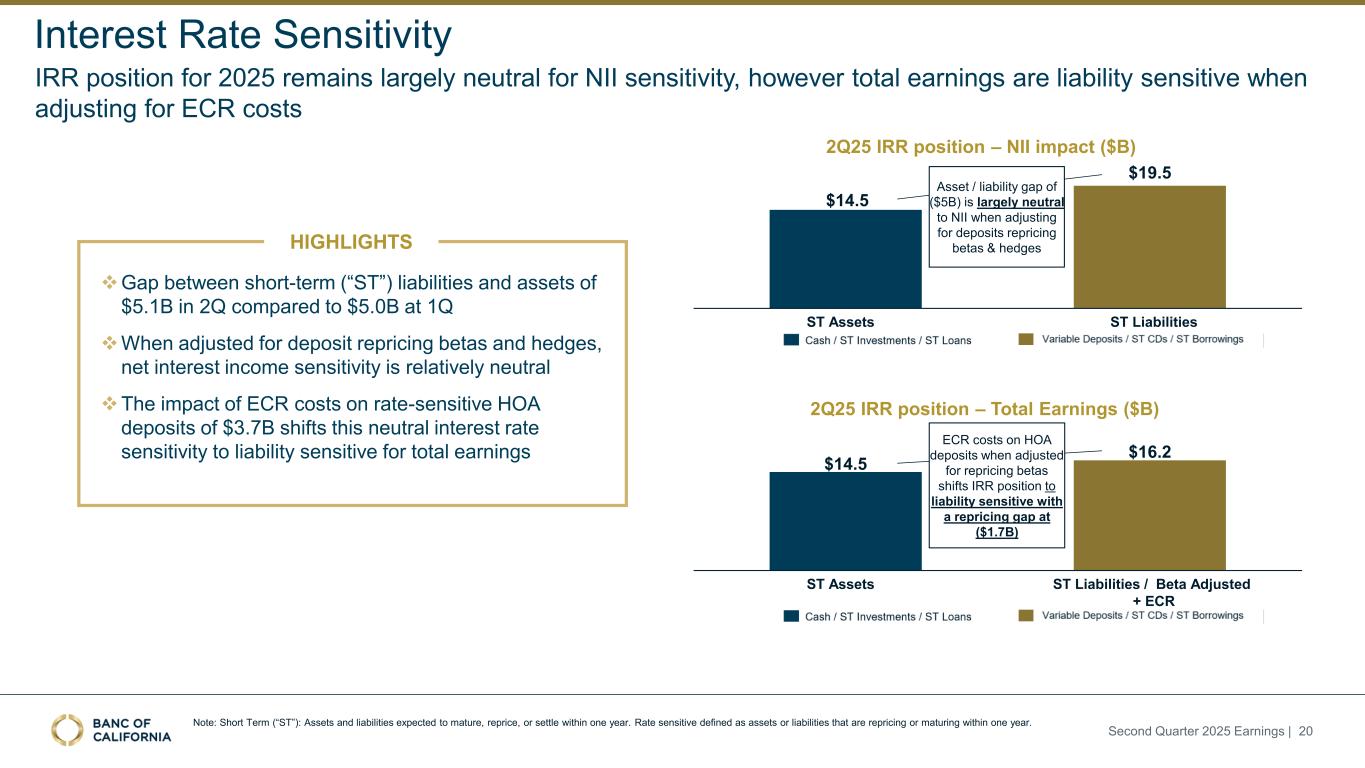9.92% 10.45% 10.27% 2Q25 1Q25 2Q24 7.65% 8.02% 7.30% 2Q25 1Q25 2Q24 CET 1 Ratio TCE Ratio(1) Note: 2Q25 regulatory capital ratios are preliminary. 1. Denotes a non-GAAP financial measure; see “Non-GAAP Reconciliation” slides in Appendix. Capital Continue to grow TBVPS and maintain healthy capital levels after impact of common stock repurchases Repurchased 5.2% of outstanding shares in 2Q25 and 1.6% in 1Q25, which impacted CET 1 ratio by 43bps and 15bps, respectively Second Quarter 2025 Earnings | 19 2Q25 1Q25 2Q24 Regulatory Well- Capitalized Excess of Well- Capitalized Consolidated Company Total Risk-Based Ratio 16.32% 16.93% 16.57% 10.00% 6.32% Tier 1 Risk-Based Capital 12.30% 12.86% 12.62% 8.00% 4.30% Common Equity Tier 1 (CET 1) 9.92% 10.45% 10.27% 6.50% 3.42% Leverage Ratio 9.74% 10.19% 9.51% 5.00% 4.74% Tangible Common Equity (TCE) Ratio (1) 7.65% 8.02% 7.30% NA NA TBVPS (1) $16.46 $16.12 $15.07 NA NA