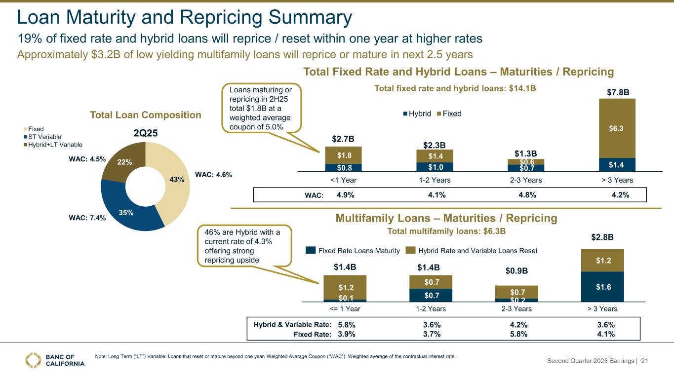 Second Quarter 2025 Earnings | 20 Note: Short Term (“ST”): Assets and liabilities expected to mature, reprice, or settle within one year. Rate sensitive defined as assets or liabilities that are repricing or maturing within one year. Interest Rate Sensitivity IRR position for 2025 remains largely neutral for NII sensitivity, however total earnings are liability sensitive when adjusting for ECR costs 2Q25 IRR position – NII impact ($B) ❖Gap between short-term (“ST”) liabilities and assets of $5.1B in 2Q compared to $5.0B at 1Q ❖When adjusted for deposit repricing betas and hedges, net interest income sensitivity is relatively neutral ❖The impact of ECR costs on rate-sensitive HOA deposits of $3.7B shifts this neutral interest rate sensitivity to liability sensitive for total earnings HIGHLIGHTS $14.5 $19.5 ST Assets ST Liabilities Asset / liability gap of ($5B) is largely neutral to NII when adjusting for deposits repricing betas & hedges 2Q25 IRR position – Total Earnings ($B) $14.5 $16.2 ST Assets ST Liabilities / Beta Adjusted + ECR ECR costs on HOA deposits when adjusted for repricing betas shifts IRR position to liability sensitive with a repricing gap at ($1.7B)