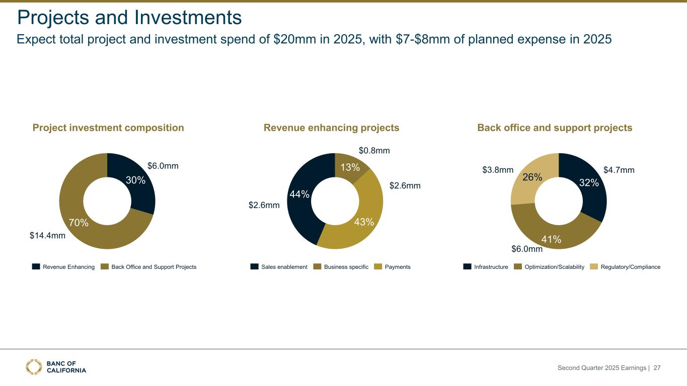 Adjusted Noninterest Expense Detail(1) ($mm) $32.4 $26.4 $71.5 $85.9 2Q24 $34.5 $12.7 $64.0 $85.6 3Q24 $31.7 $11.2 $61.9 $77.7 4Q24 $27.8 $7.3 $62.2 $86.4 1Q25 $26.6 $9.4 $61.5 $88.4 2Q25 $216.3 $196.7 $182.4 $183.7 $185.9 Compensation expense Other operating expenses Insurance and assessments Customer related expense Customer Related Expense ($mm) $27.7 $4.7 2Q24 $29.9 $4.6 3Q24 $27.4 $4.2 4Q24 $23.6 $4.1 1Q25 $21.9 $4.7 2Q25 $32.4 $34.5 $31.7 $27.8 $26.6 ECR Expense Other(2) 1. Excludes acquisition, integration and reorganization costs. Denotes a non-GAAP measure, see “Non-GAAP Reconciliation” slides in Appendix. 2. Other customer related expense includes deposit referral fees, armored car services, check printing expenses, and other miscellaneous expenses Customer Related Expense Lower ECR expense mostly driven by mix-shift into lower cost HOA deposits 2Q24 3Q24 4Q24 1Q25 2Q25 $3,812 $3,758 $3,730 $3,739 $3,728 Average HOA Deposits ($mm) ECR indexed to Fed Funds rate with high beta and will continue to fluctuate with Fed rate moves Substantially all HOA deposits have ECR expenses; average deposit rate (excluding ECR costs) for 2Q25 is 81bps Second Quarter 2025 Earnings | 26