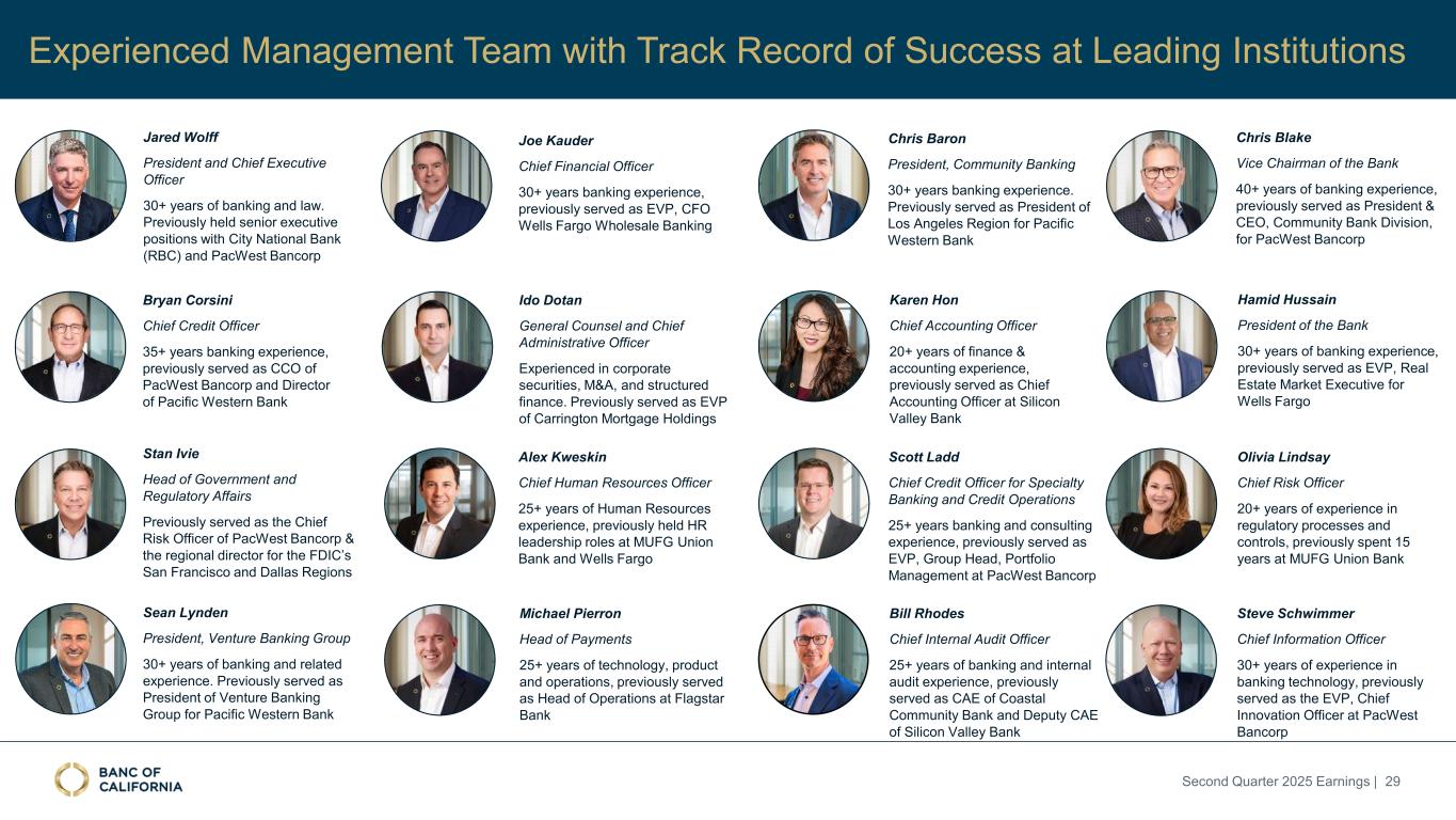 Experienced Management Team with Track Record of Success at Leading Institutions Alex Kweskin Chief Human Resources Officer 25+ years of Human Resources experience, previously held HR leadership roles at MUFG Union Bank and Wells Fargo Chris Blake Vice Chairman of the Bank 40+ years of banking experience, previously served as President & CEO, Community Bank Division, for PacWest Bancorp Scott Ladd Chief Credit Officer for Specialty Banking and Credit Operations 25+ years banking and consulting experience, previously served as EVP, Group Head, Portfolio Management at PacWest Bancorp Hamid Hussain President of the Bank 30+ years of banking experience, previously served as EVP, Real Estate Market Executive for Wells Fargo Bryan Corsini Chief Credit Officer 35+ years banking experience, previously served as CCO of PacWest Bancorp and Director of Pacific Western Bank Ido Dotan General Counsel and Chief Administrative Officer Experienced in corporate securities, M&A, and structured finance. Previously served as EVP of Carrington Mortgage Holdings Olivia Lindsay Chief Risk Officer 20+ years of experience in regulatory processes and controls, previously spent 15 years at MUFG Union Bank Steve Schwimmer Chief Information Officer 30+ years of experience in banking technology, previously served as the EVP, Chief Innovation Officer at PacWest Bancorp Stan Ivie Head of Government and Regulatory Affairs Previously served as the Chief Risk Officer of PacWest Bancorp & the regional director for the FDIC’s San Francisco and Dallas Regions Michael Pierron Head of Payments 25+ years of technology, product and operations, previously served as Head of Operations at Flagstar Bank Sean Lynden President, Venture Banking Group 30+ years of banking and related experience. Previously served as President of Venture Banking Group for Pacific Western Bank Chris Baron President, Community Banking 30+ years banking experience. Previously served as President of Los Angeles Region for Pacific Western Bank Karen Hon Chief Accounting Officer 20+ years of finance & accounting experience, previously served as Chief Accounting Officer at Silicon Valley Bank Jared Wolff President and Chief Executive Officer 30+ years of banking and law. Previously held senior executive positions with City National Bank (RBC) and PacWest Bancorp Joe Kauder Chief Financial Officer 30+ years banking experience, previously served as EVP, CFO Wells Fargo Wholesale Banking Second Quarter 2025 Earnings | 29 Bill Rhodes Chief Internal Audit Officer 25+ years of banking and internal audit experience, previously served as CAE of Coastal Community Bank and Deputy CAE of Silicon Valley Bank