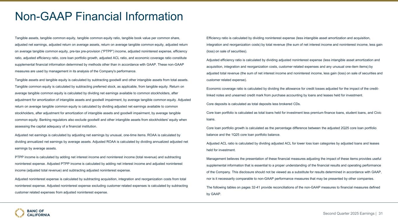 Non-GAAP Financial Information Tangible assets, tangible common equity, tangible common equity ratio, tangible book value per common share, adjusted net earnings, adjusted return on average assets, return on average tangible common equity, adjusted return on average tangible common equity, pre-tax pre-provision (“PTPP”) income, adjusted noninterest expense, efficiency ratio, adjusted efficiency ratio, core loan portfolio growth, adjusted ACL ratio, and economic coverage ratio constitute supplemental financial information determined by methods other than in accordance with GAAP. These non-GAAP measures are used by management in its analysis of the Company's performance. Tangible assets and tangible equity is calculated by subtracting goodwill and other intangible assets from total assets. Tangible common equity is calculated by subtracting preferred stock, as applicable, from tangible equity. Return on average tangible common equity is calculated by dividing net earnings available to common stockholders, after adjustment for amortization of intangible assets and goodwill impairment, by average tangible common equity. Adjusted return on average tangible common equity is calculated by dividing adjusted net earnings available to common stockholders, after adjustment for amortization of intangible assets and goodwill impairment, by average tangible common equity. Banking regulators also exclude goodwill and other intangible assets from stockholders' equity when assessing the capital adequacy of a financial institution. Adjusted net earnings is calculated by adjusting net earnings by unusual, one-time items. ROAA is calculated by dividing annualized net earnings by average assets. Adjusted ROAA is calculated by dividing annualized adjusted net earnings by average assets. PTPP income is calculated by adding net interest income and noninterest income (total revenue) and subtracting noninterest expense. Adjusted PTPP income is calculated by adding net interest income and adjusted noninterest income (adjusted total revenue) and subtracting adjusted noninterest expense. Adjusted noninterest expense is calculated by subtracting acquisition, integration and reorganization costs from total noninterest expense. Adjusted noninterest expense excluding customer related expenses is calculated by subtracting customer related expenses from adjusted noninterest expense. Efficiency ratio is calculated by dividing noninterest expense (less intangible asset amortization and acquisition, integration and reorganization costs) by total revenue (the sum of net interest income and noninterest income, less gain (loss) on sale of securities). Adjusted efficiency ratio is calculated by dividing adjusted noninterest expense (less intangible asset amortization and acquisition, integration and reorganization costs, customer related expenses and any unusual one-item items) by adjusted total revenue (the sum of net interest income and noninterest income, less gain (loss) on sale of securities and customer related expense). Economic coverage ratio is calculated by dividing the allowance for credit losses adjusted for the impact of the credit- linked notes and unearned credit mark from purchase accounting by loans and leases held for investment. Core deposits is calculated as total deposits less brokered CDs. Core loan portfolio is calculated as total loans held for investment less premium finance loans, student loans, and Civic loans. Core loan portfolio growth is calculated as the percentage difference between the adjusted 2Q25 core loan portfolio balance and the 1Q25 core loan portfolio balance. Adjusted ACL ratio is calculated by dividing adjusted ACL for lower loss loan categories by adjusted loans and leases held for investment. Management believes the presentation of these financial measures adjusting the impact of these items provides useful supplemental information that is essential to a proper understanding of the financial results and operating performance of the Company. This disclosure should not be viewed as a substitute for results determined in accordance with GAAP, nor is it necessarily comparable to non-GAAP performance measures that may be presented by other companies. The following tables on pages 32-41 provide reconciliations of the non-GAAP measures to financial measures defined by GAAP. Second Quarter 2025 Earnings | 31