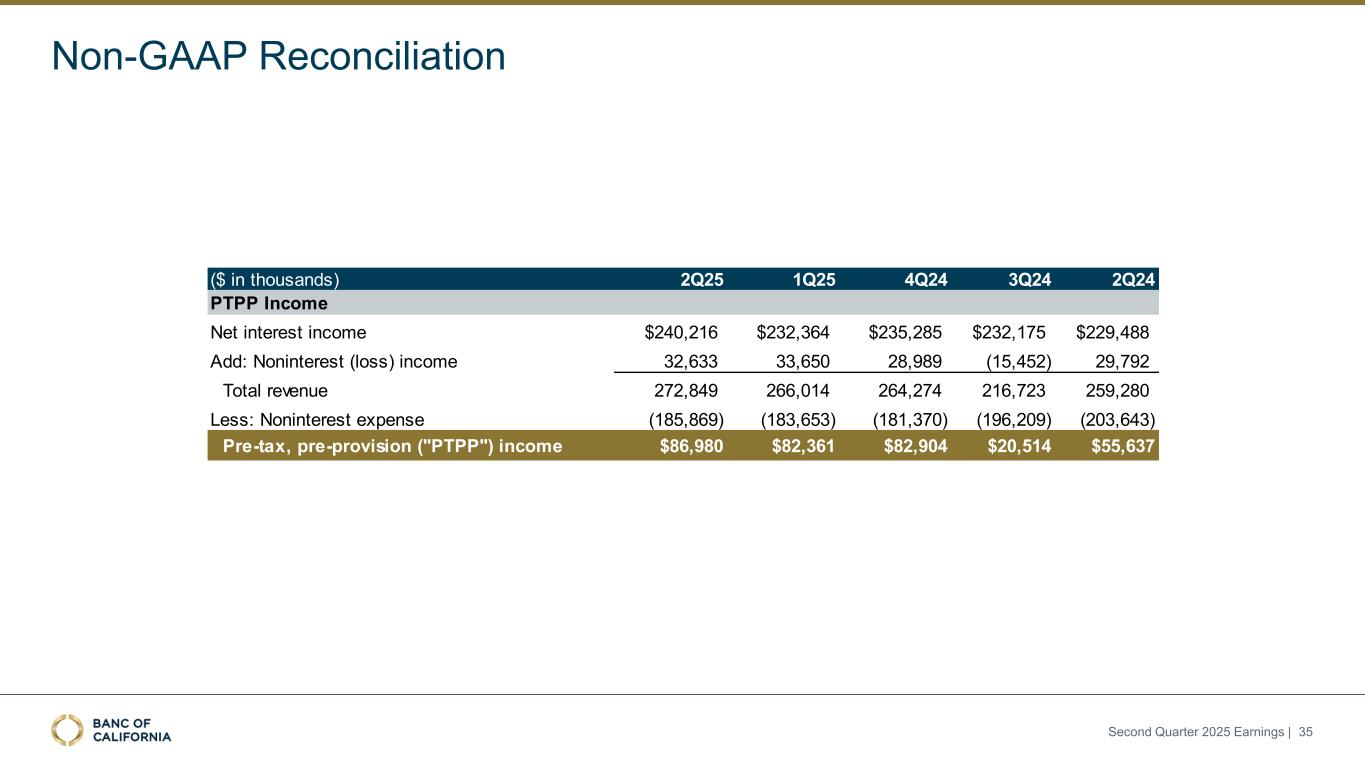 1. Effective tax rates of 23.12% 25.30%, 24.76%, 27.61%, and 28.62% used for the three months ended June 30, 2025, March 31, 2025, December 31, 2024, September 30, 2024, and June 30, 2024, respectively. 2. Adjusted net earnings available to common and equivalent stockholders divided by weighted average common shares outstanding. 3. Annualized net earnings divided by average assets. 4. Annualized adjusted net earnings divided by average assets. Non-GAAP Reconciliation Second Quarter 2025 Earnings | 34 ($ in thousands, except per share amounts) 2Q25 1Q25 4Q24 3Q24 2Q24 Net earnings $28,385 $53,568 $56,919 $8,784 $30,333 Earnings before income taxes $73,061 $70,103 $11,514 $44,637 Add: Loss on sale of securities NA NA 59,946 NA Less: Acquisition, integration, and reorganization costs NA NA (510) NA Adjusted earnings before income taxes 73,061 70,103 70,950 44,637 Adjusted income tax expense(1) (19,493) (13,184) (19,589) (14,304) Adjustments: Provision for credit losses related to transfer of loans to held for sale 26,289 Tax impact of adjustment above(1) (6,078) Income tax related adjustments 9,792 Adjustment to net earnings 30,003 Adjusted net earnings 58,388 53,568 56,919 51,361 30,333 Less: Preferred stock dividends (9,947) (9,947) (9,947) (9,947) (9,947) Adjusted net earnings available to common and equivalent stockholders $48,441 $43,621 $46,972 $41,414 $20,386 Weighted average common shares outstanding 158,462 169,434 169,732 168,583 168,432 Diluted earnings (loss) per common share $0.12 $0.26 $0.28 ($0.01) $0.12 Adjusted diluted earnings per common share(2) $0.31 $0.26 $0.28 $0.25 $0.12 Average total assets $33,764,149 $33,308,385 $33,562,028 $34,426,185 $35,834,467 Return on average assets ("ROAA")(3) 0.34% 0.65% 0.67% 0.10% 0.34% Adjusted ROAA(4) 0.69% 0.65% 0.67% 0.59% 0.34% Adjusted Net Earnings