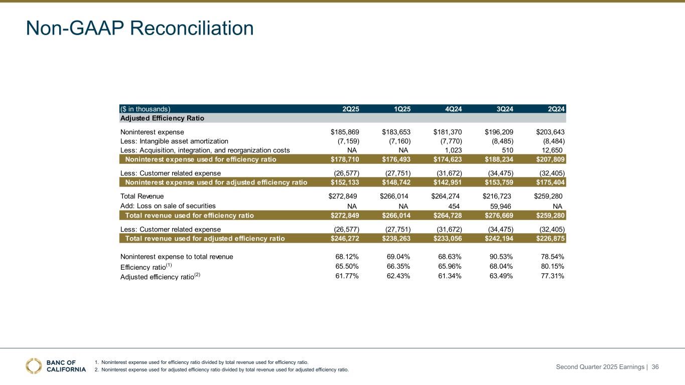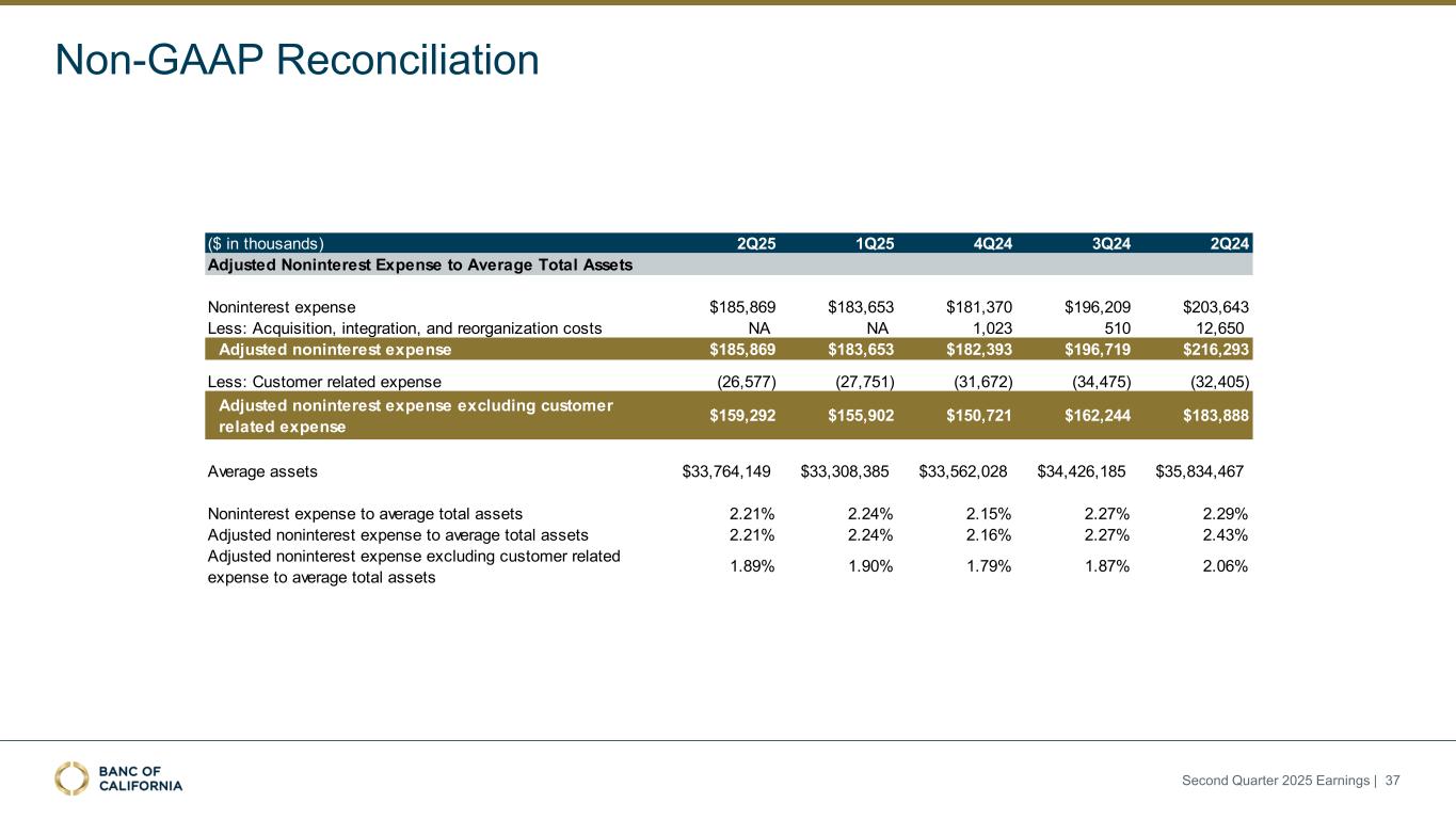 Non-GAAP Reconciliation 1. Noninterest expense used for efficiency ratio divided by total revenue used for efficiency ratio. 2. Noninterest expense used for adjusted efficiency ratio divided by total revenue used for adjusted efficiency ratio. ($ in thousands) 2Q25 1Q25 4Q24 3Q24 2Q24 Noninterest expense $185,869 $183,653 $181,370 $196,209 $203,643 Less: Intangible asset amortization (7,159) (7,160) (7,770) (8,485) (8,484) Less: Acquisition, integration, and reorganization costs NA NA 1,023 510 12,650 Noninterest expense used for efficiency ratio $178,710 $176,493 $174,623 $188,234 $207,809 Less: Customer related expense (26,577) (27,751) (31,672) (34,475) (32,405) Noninterest expense used for adjusted efficiency ratio $152,133 $148,742 $142,951 $153,759 $175,404 Total Revenue $272,849 $266,014 $264,274 $216,723 $259,280 Add: Loss on sale of securities NA NA 454 59,946 NA Total revenue used for efficiency ratio $272,849 $266,014 $264,728 $276,669 $259,280 #N/A #N/A #N/A #N/A #N/A Less: Customer related expense (26,577) (27,751) (31,672) (34,475) (32,405) Total revenue used for adjusted efficiency ratio $246,272 $238,263 $233,056 $242,194 $226,875 Noninterest expense to total revenue 68.12% 69.04% 68.63% 90.53% 78.54% Efficiency ratio(1) 65.50% 66.35% 65.96% 68.04% 80.15% Adjusted efficiency ratio(2) 61.77% 62.43% 61.34% 63.49% 77.31% Adjusted Efficiency Ratio Second Quarter 2025 Earnings | 36