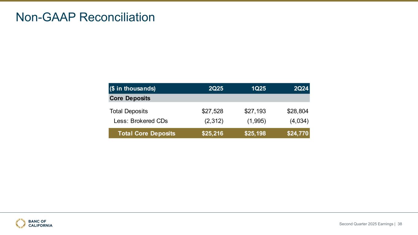 Non-GAAP Reconciliation ($ in thousands) 2Q25 1Q25 4Q24 3Q24 2Q24 Noninterest expense $185,869 $183,653 $181,370 $196,209 $203,643 Less: Acquisition, integration, and reorganization costs NA NA 1,023 510 12,650 Adjusted noninterest expense $185,869 $183,653 $182,393 $196,719 $216,293 Less: Customer related expense (26,577) (27,751) (31,672) (34,475) (32,405) Adjusted noninterest expense excluding customer related expense $159,292 $155,902 $150,721 $162,244 $183,888 Average assets $33,764,149 $33,308,385 $33,562,028 $34,426,185 $35,834,467 Noninterest expense to average total assets 2.21% 2.24% 2.15% 2.27% 2.29% Adjusted noninterest expense to average total assets 2.21% 2.24% 2.16% 2.27% 2.43% Adjusted noninterest expense excluding customer related expense to average total assets 1.89% 1.90% 1.79% 1.87% 2.06% Adjusted Noninterest Expense to Average Total Assets Second Quarter 2025 Earnings | 37
