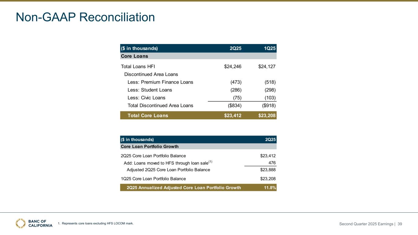 Non-GAAP Reconciliation Second Quarter 2025 Earnings | 38 ($ in thousands) 2Q25 1Q25 2Q24 Total Deposits $27,528 $27,193 $28,804 Less: Brokered CDs (2,312) (1,995) (4,034) Total Core Deposits $25,216 $25,198 $24,770 Core Deposits