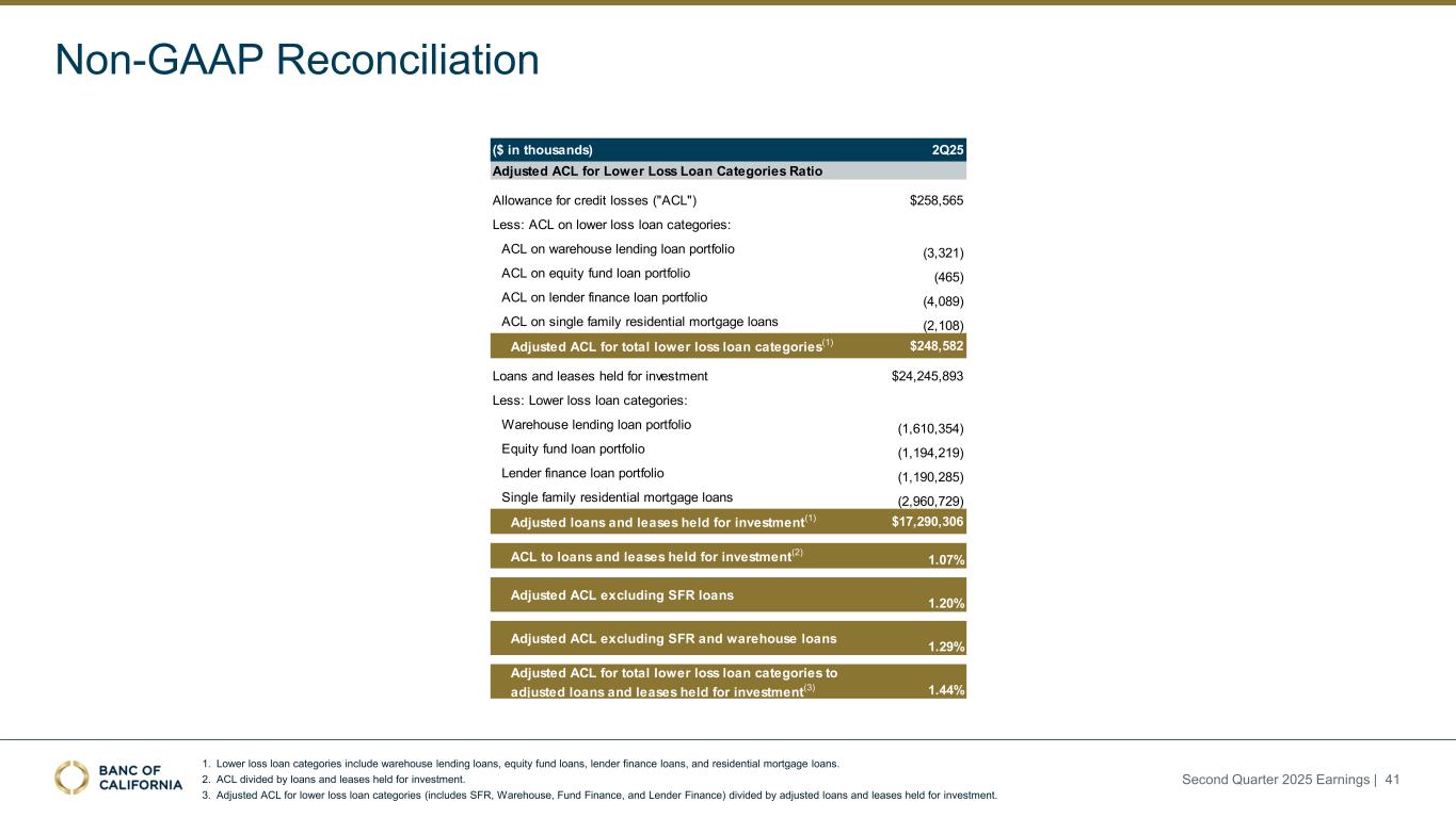 Non-GAAP Reconciliation 1. Unearned credit mark from purchase accounting estimated by using the same pro rata split between the credit and yield marks associated with the non-PCD loans (purchased loans without credit deterioration at the time of the purchase) at the time of the acquisition. 2. Credit-linked notes loss coverage equal to 5% of the unpaid principal balance of the pledged loans. 3. Allowance for credit losses divided by loans and leases held for investment. 4. Adjusted allowance for credit losses divided by loans and leases held for investment. Second Quarter 2025 Earnings | 40 ($ in thousands) 2Q25 1Q25 4Q24 3Q24 2Q24 Allowance for credit losses ("ACL") $258,565 $264,557 $268,431 $281,916 $275,333 Add: Unearned credit mark from purchase accounting (1) 19,199 20,870 22,473 24,678 26,982 Add: Credit-linked notes(2) 112,887 115,188 116,991 120,617 122,523 Adjusted allowance for credit losses $390,651 $400,616 $407,896 $427,212 $424,837 Loans and leases held for investment $24,245,893 $24,126,527 $23,781,663 $23,527,777 $23,228,909 ACL to loans and leases held for investment(3) 1.07% 1.10% 1.13% 1.20% 1.19% Economic coverage ratio(4) 1.61% 1.66% 1.72% 1.82% 1.83% Economic coverage ratio