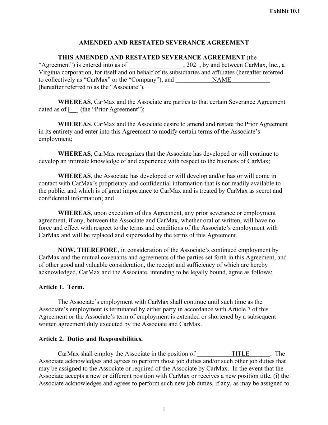 1 AMENDED AND RESTATED SEVERANCE AGREEMENT THIS AMENDED AND RESTATED SEVERANCE AGREEMENT (the “Agreement”) is entered into as of _________________, 202_, by and between CarMax, Inc., a Virginia corporation, for itself and on behalf of its subsidiaries and affiliates (hereafter referred to collectively as “CarMax” or the “Company”), and NAME (hereafter referred to as the “Associate”). WHEREAS, CarMax and the Associate are parties to that certain Severance Agreement dated as of [__] (the “Prior Agreement”); WHEREAS, CarMax and the Associate desire to amend and restate the Prior Agreement in its entirety and enter into this Agreement to modify certain terms of the Associate’s employment; WHEREAS, CarMax recognizes that the Associate has developed or will continue to develop an intimate knowledge of and experience with respect to the business of CarMax; WHEREAS, the Associate has developed or will develop and/or has or will come in contact with CarMax’s proprietary and confidential information that is not readily available to the public, and which is of great importance to CarMax and is treated by CarMax as secret and confidential information; and WHEREAS, upon execution of this Agreement, any prior severance or employment agreement, if any, between the Associate and CarMax, whether oral or written, will have no force and effect with respect to the terms and conditions of the Associate’s employment with CarMax and will be replaced and superseded by the terms of this Agreement. NOW, THEREFORE, in consideration of the Associate’s continued employment by CarMax and the mutual covenants and agreements of the parties set forth in this Agreement, and of other good and valuable consideration, the receipt and sufficiency of which are hereby acknowledged, CarMax and the Associate, intending to be legally bound, agree as follows: Article 1. Term. The Associate’s employment with CarMax shall continue until such time as the Associate’s employment is terminated by either party in accordance with Article 7 of this Agreement or the Associate’s term of employment is extended or shortened by a subsequent written agreement duly executed by the Associate and CarMax. Article 2. Duties and Responsibilities. CarMax shall employ the Associate in the position of TITLE . The Associate acknowledges and agrees to perform those job duties and/or such other job duties that may be assigned to the Associate or required of the Associate by CarMax. In the event that the Associate accepts a new or different position with CarMax or receives a new position title, (i) the Associate acknowledges and agrees to perform such new job duties, if any, as may be assigned to Exhibit 10.1