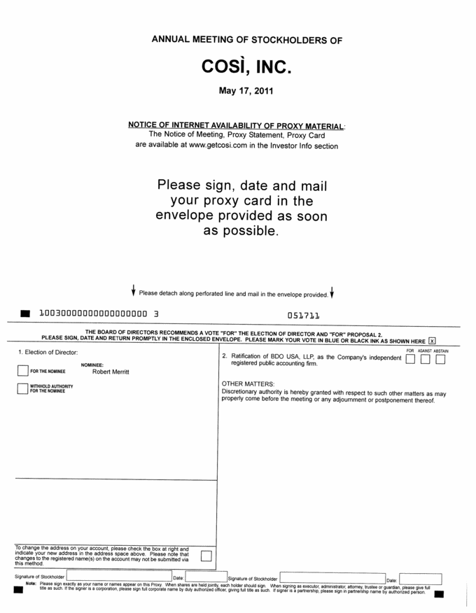 ANNUAL MEETING OF STOCKHOLDERS OF COSi, INC. May 17, 2011 NOTICE OF INTERNET AVAILABILITY OF PROXY MATERIAL: The Notice of Meeting, Proxy Statement, Proxy Card are available at www.getcosi.com in the Investor Info section Please sign, date and mail your proxy card in the envelope provided as soon as possible. Please detach along perforated line and mail in the envelope provided. 10030000000000000000 3 051711 THE BOARD OF DIRECTORS RECOMMENDS A VOTE “FOR” THE ELECTION OF DIRECTOR AND “FOR” PROPOSAL 2. PLEASE SIGN, DATE AND RETURN PROMPTLY IN THE ENCLOSED ENVELOPE. PLEASE MARK YOUR VOTE IN BLUE OR BLACK INK AS SHOWN HERE FOR AGAINST ABSTAIN 1. Election of Director: NOMINEE: FOR THE NOMINEE Robert Merritt WITHHOLD AUTHORITY FOR THE NOMINEE 2. Ratification of BDO USA, LLP, as the Company’s independent registered public accounting firm. OTHER MATTERS: Discretionary authority is hereby granted with respect to such other matters as may properly come before the meeting or any adjournment or postponement thereof. To change the address on your account, please check the box at right and indicate your new address in the address space above. Please note that changes to the registered name(s) on the account may not be submitted via this method. Signature of Stockholder Date: Signature of Stockholder Date: Please sign exactly as your name or names appear on this Proxy. When shares are hold jointly, each holder should sign. When signing as executor, administrator, attorney, trustee or guardian, please give full title as such. If the signer is a corporation, please sign full corporate name by duty authorized office, giving full title as such. If signer is a partnership, please sign in partnership name by authorized person. |