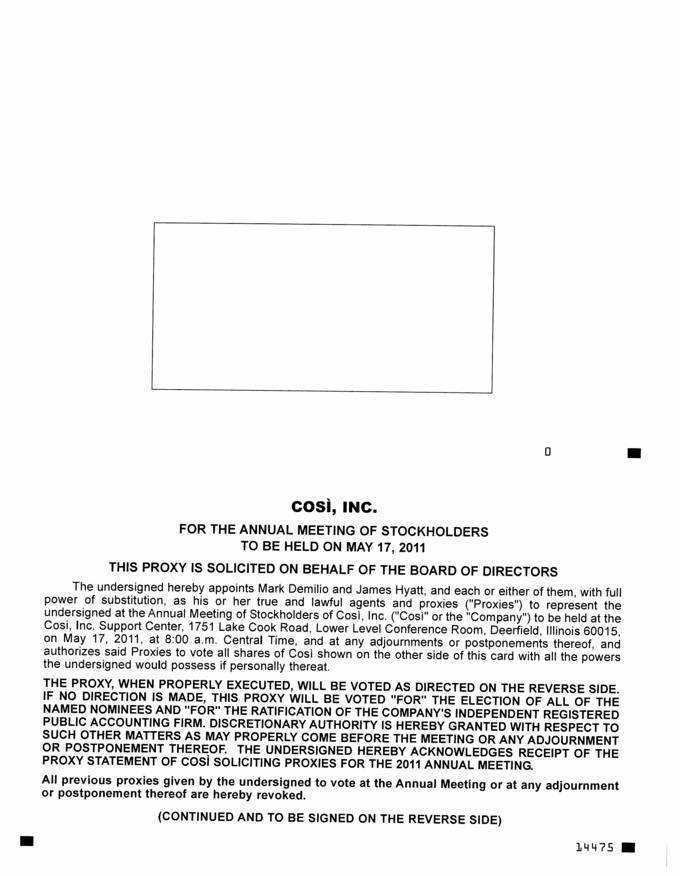 COSi, INC. FOR THE ANNUAL MEETING OF STOCKHOLDERS TO BE HELD ON MAY 17, 2011 THIS PROXY IS SOLICITED ON BEHALF OF THE BOARD OF DIRECTORS The undersigned hereby appoints Mark Demilio and James Hyatt, and each or either of them, with full power of substitution, as his or her true and lawful agents and proxies (“Proxies”) to represent the undersigned at the Annual Meeting of Stockholders of Cosi, Inc. (“Cosi” or the “Company”) to be held at the Cosi, Inc. Support Center, 1751 Lake Cook Road, Lower Level Conference Room, Deerfield, Illinois 60015, on May 17, 2011, at 8:00 am. Central Time, and at any adjournments or postponements thereof, and authorizes said Proxies to vote all shares of Cosi shown on the other side of this card with all the powers the undersigned would possess if personally thereat. THE PROXY, WHEN PROPERLY EXECUTED, WILL BE VOTED AS DIRECTED ON THE REVERSE SIDE. IF NO DIRECTION IS MADE, THIS PROXY WILL BE VOTED “FOR” THE ELECTION OF ALL OF THE NAMED NOMINEES AND “FOR” THE RATIFICATION OF THE COMPANY’S INDEPENDENT REGISTERED PUBLIC ACCOUNTING FIRM. DISCRETIONARY AUTHORITY IS HEREBY GRANTED WITH RESPECT TO SUCH OTHER MATTERS AS MAY PROPERLY COME BEFORE THE MEETING OR ANY ADJOURNMENT OR POSTPONEMENT THEREOF. THE UNDERSIGNED HEREBY ACKNOWLEDGES RECEIPT OF THE PROXY STATEMENT OF COSI SOLICITING PROXIES FOR THE 2011 ANNUAL MEETING. All previous proxies given by the undersigned to vote at the Annual Meeting or at any adjournment or postponement thereof are hereby revoked. (CONTINUED AND TO BE SIGNED ON THE REVERSE SIDE) |